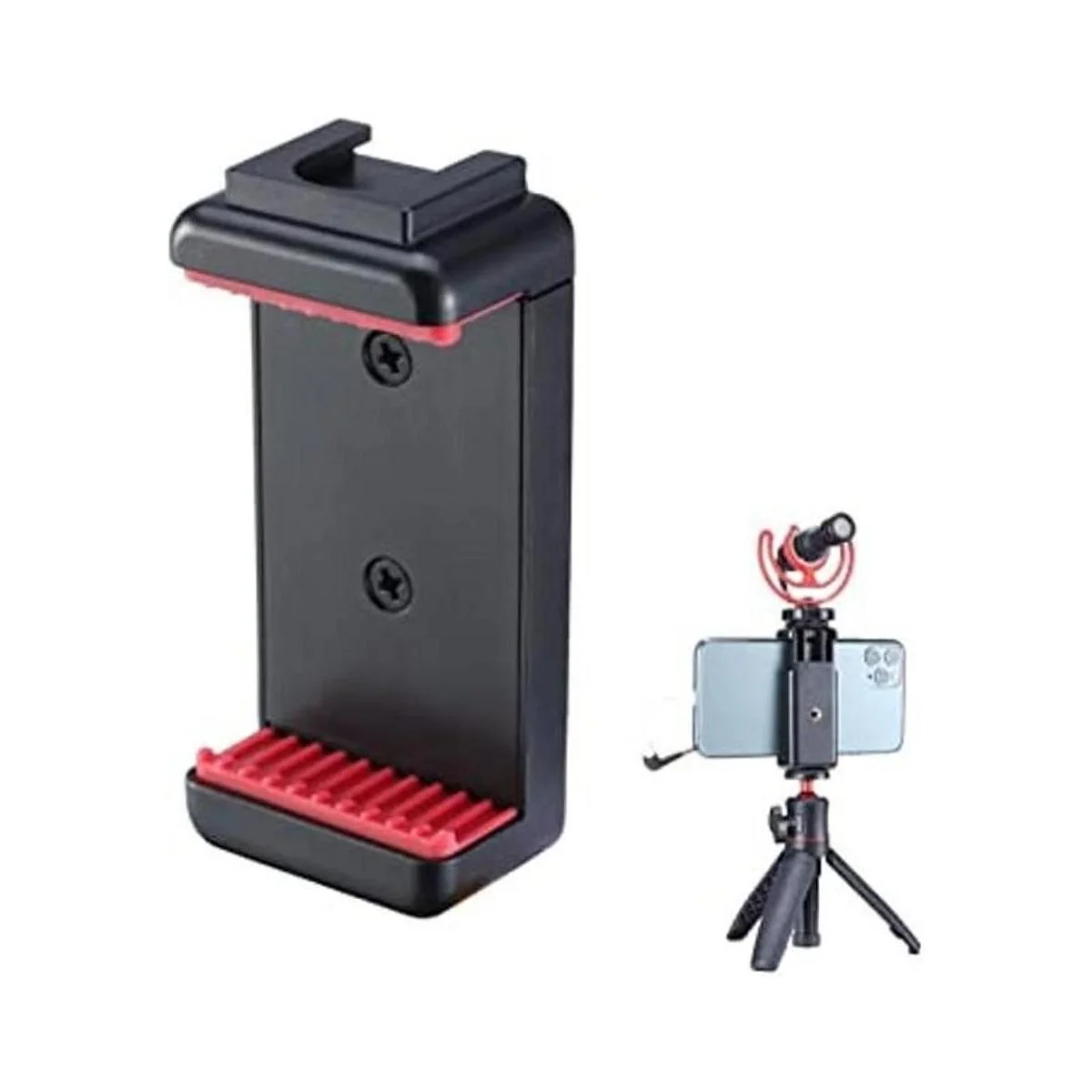 Tornillo de 1/4 pulgadas en la parte inferior: hay un tornillo de 1/4 pulgadas en la parte inferior del soporte del trípode del teléfono, por lo que puedes montarlo en cualquier trípode que tenga rosca de 1/4 pulgadas.