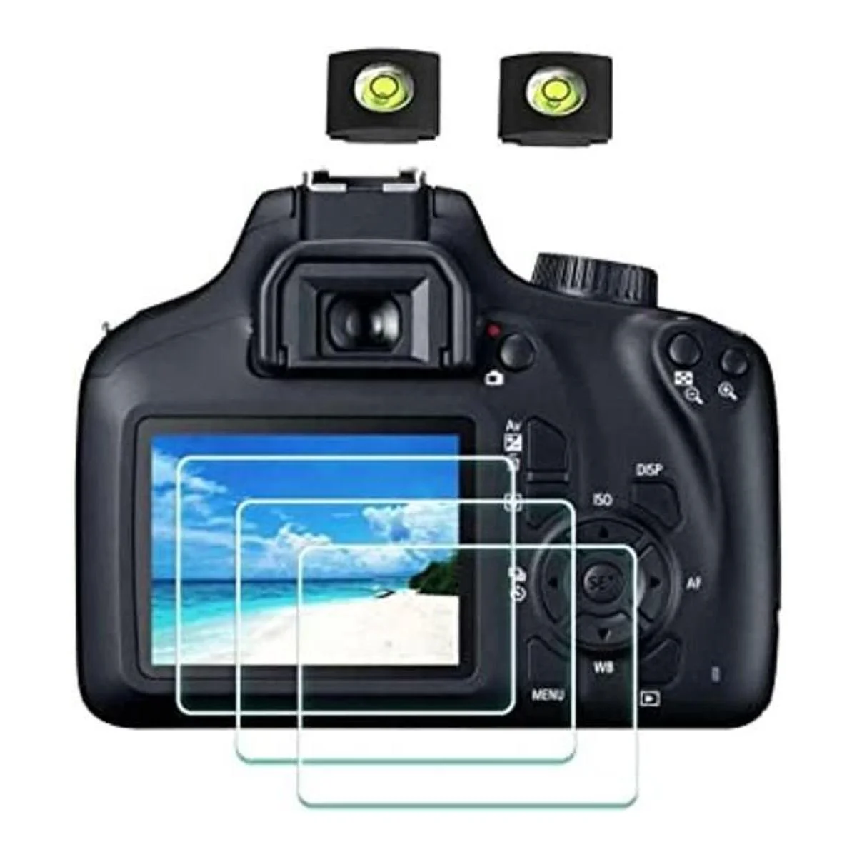 Protector de pantalla LCD y funda de zapata con nivel de burbuja que se ajusta perfectamente a la cámara Canon EOS 4000D Rebel T100. Fácil de instalar con adhesivos 100 sin burbujas, instalación sin burbujas.