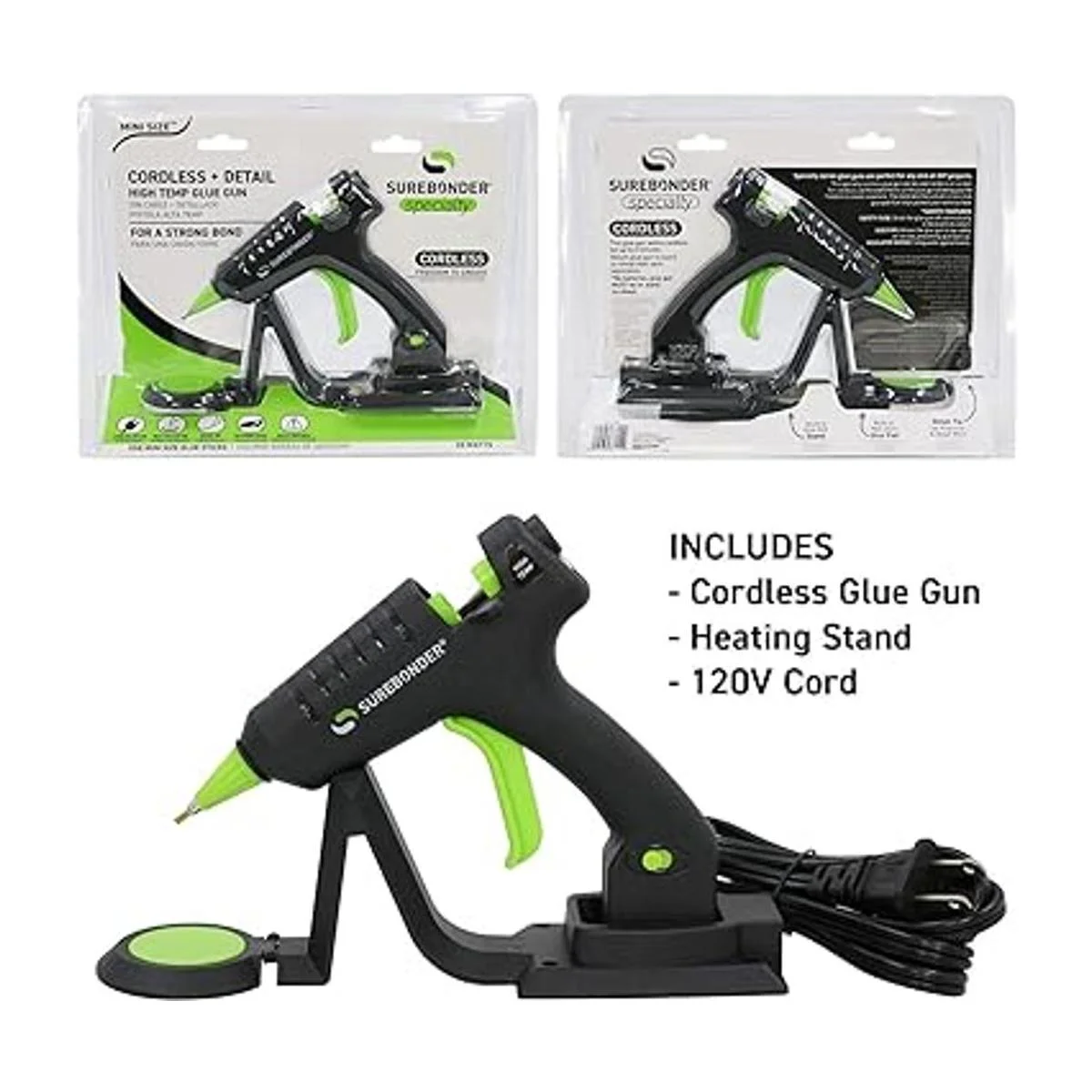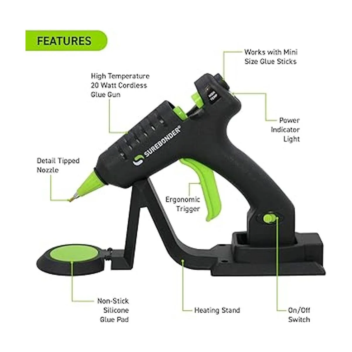 Surebonder Las s de pegamento tienen características de seguridad integradas como una boquilla aislada y un fusible. Para facilidad de uso, viene con una almohadilla de silicona antiadherente para proteger tu mesa y la base de carga se mantiene perfectamente en tu mesa cuando no esté en uso.
