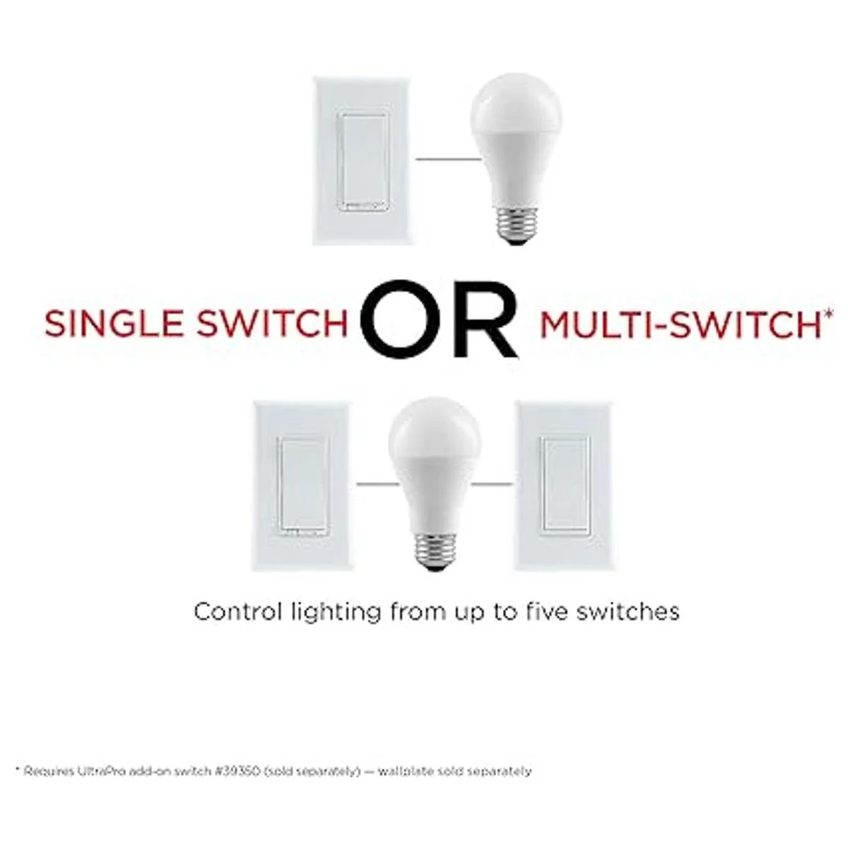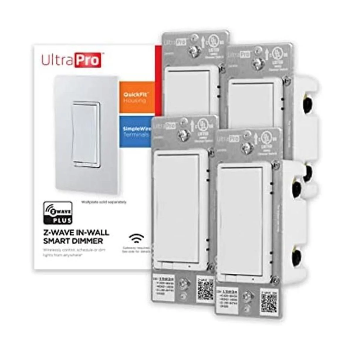 UltraPro ZWave Regulador de luz basculante inteligente con QuickFit y SimpleWire, listo para 3 vías, funciona con Alexa, Google Assistant, ZWave Hub Requerido, repetidorextensor de rango, paleta blanca solamente, paquete de 4, 54898