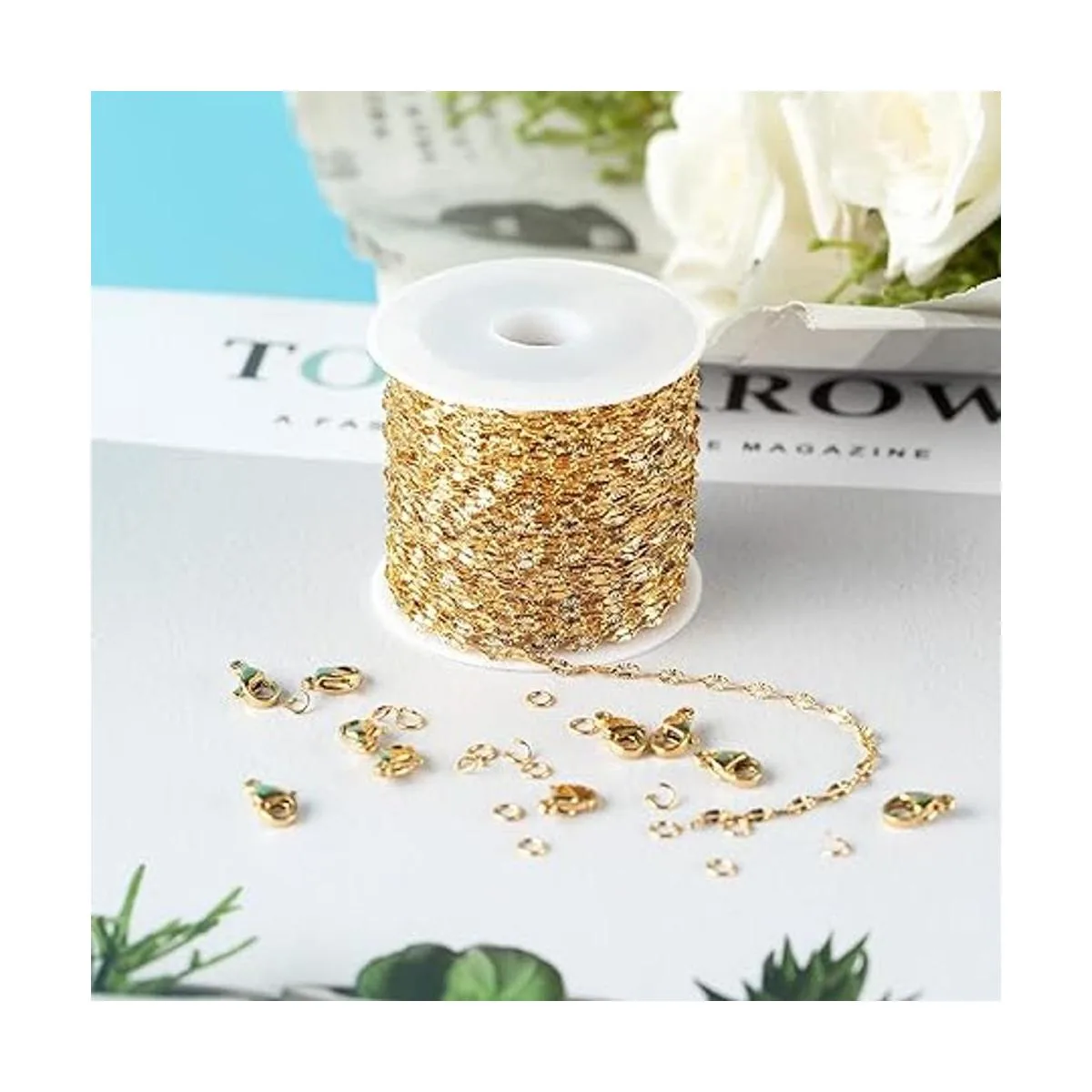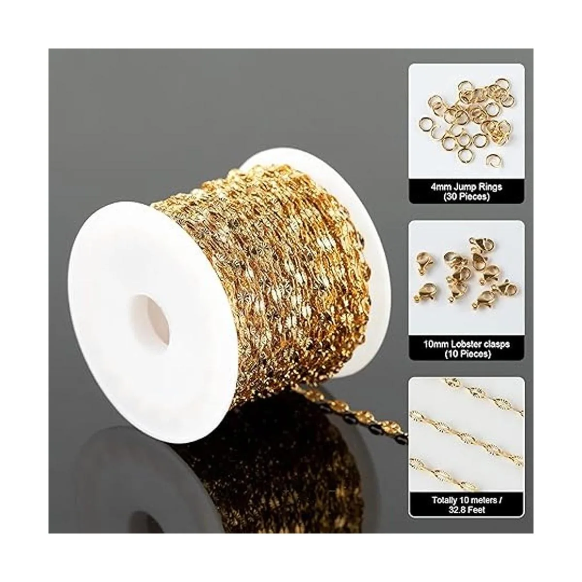 El paquete incluye: los suministros para hacer joyas incluyen un rollo de cadena de eslabones finos dorados para hacer joyas 32.8 ft, vienen con accesorios de joyería, 30 anillos de salto, 10 cierres de mosquetón. Es conveniente utilizarlos junto con la cadena para tu pulsera y collar colgante, perfecto para tu proyecto de fabricación de joyas.