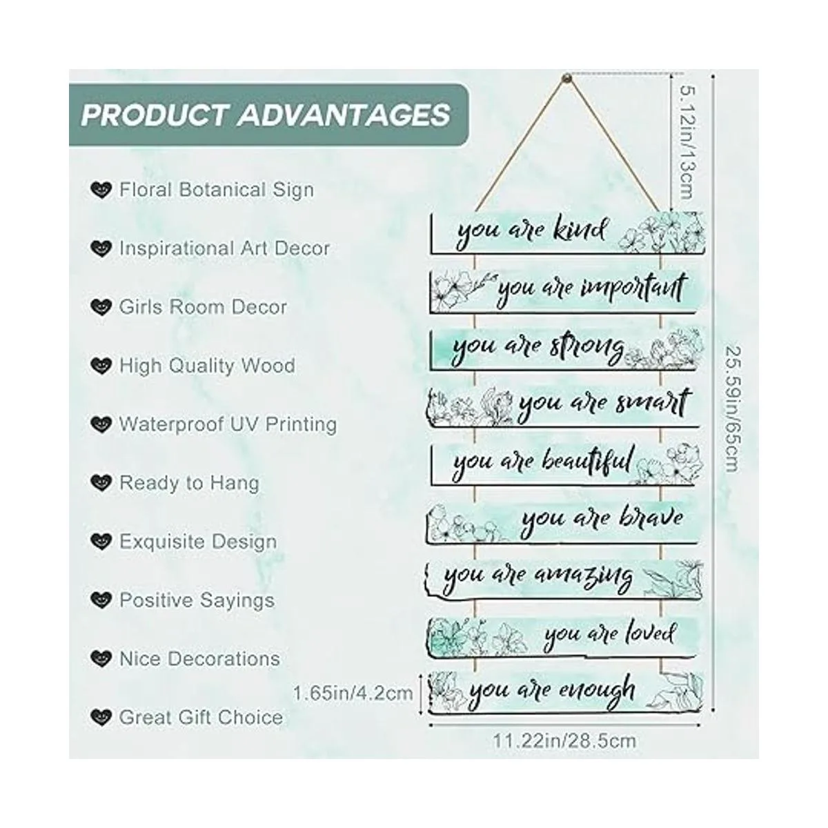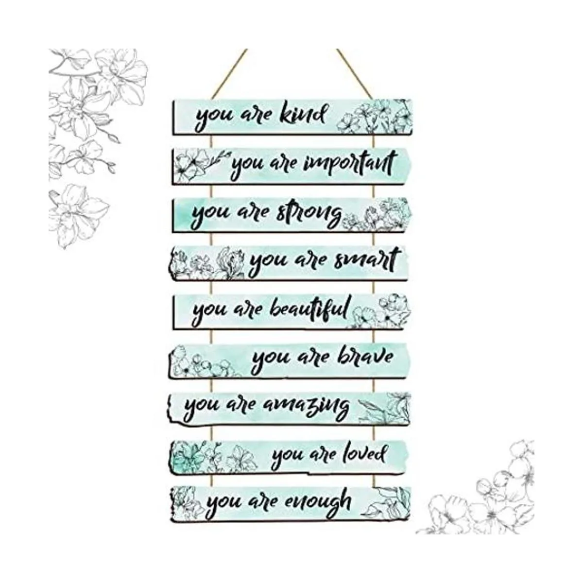 Diseño con frases positivas: cuando estás deprimido, mirando las placas de decoración de pared de la niña grabadas con declaraciones inspiradoras, como You are beautiful, You are importante, y te animarán, dándote aliento y confianza