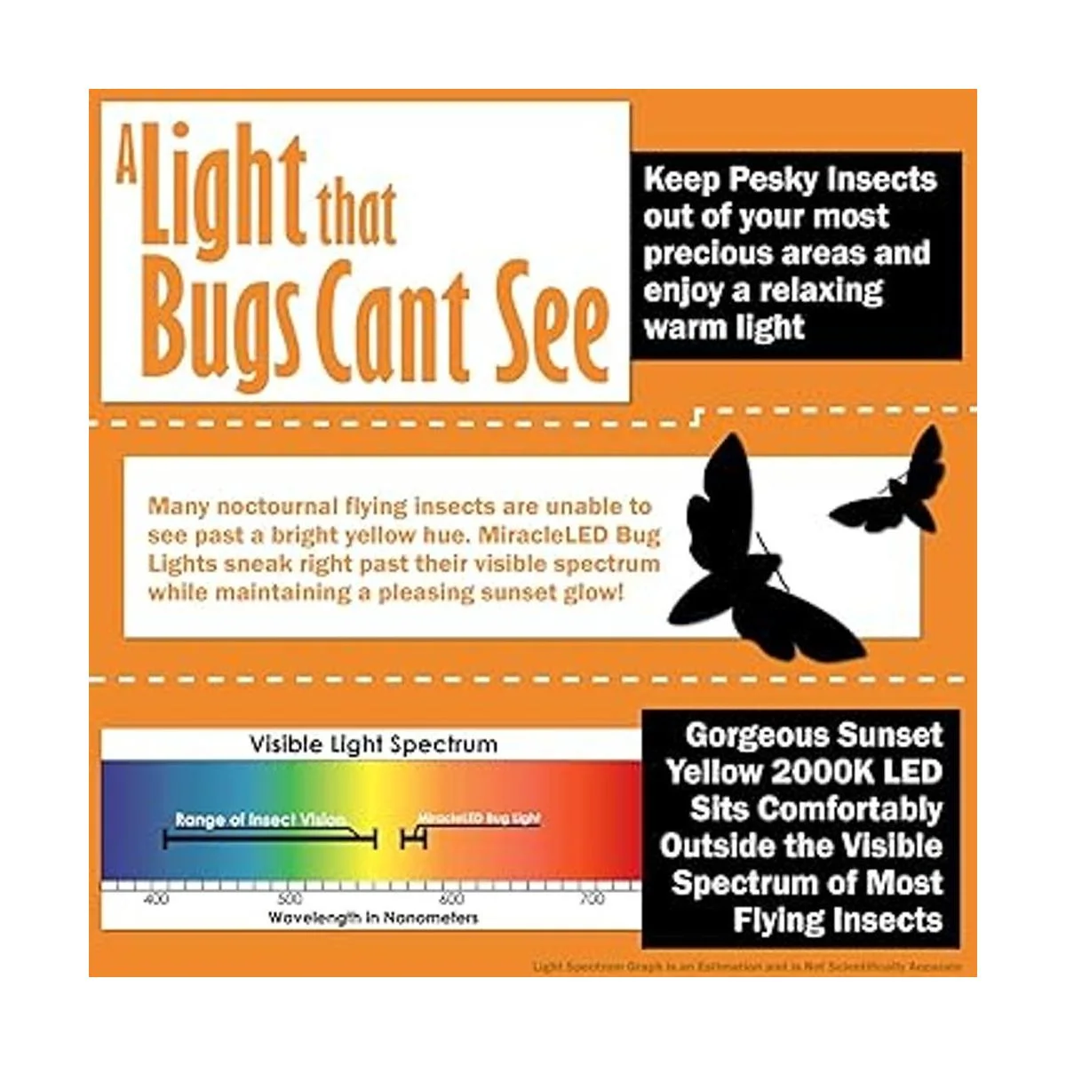 Espectro de luz amarilla ámbar probado invisible para la mayoría de insectos voladores y agradable para los humanos. La misma tecnología probada en cabinas e iluminación exterior durante décadas. No te dejes caer por bombillas pintadas o amarillas. Las tapas amarillas solo ocultan el diseño defectuoso utilizando diodos azules, las bombillas UnEdison son amarillas de la fuente del diodo y no requieren una cubierta fea que simplemente da a los humanos la impresión de amarillo.