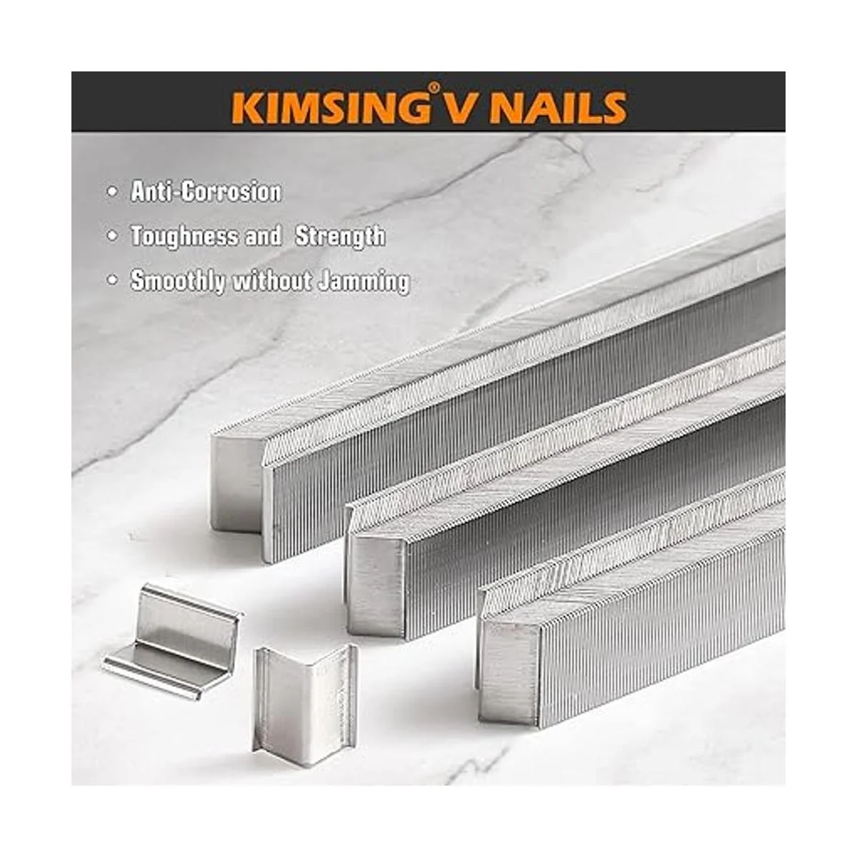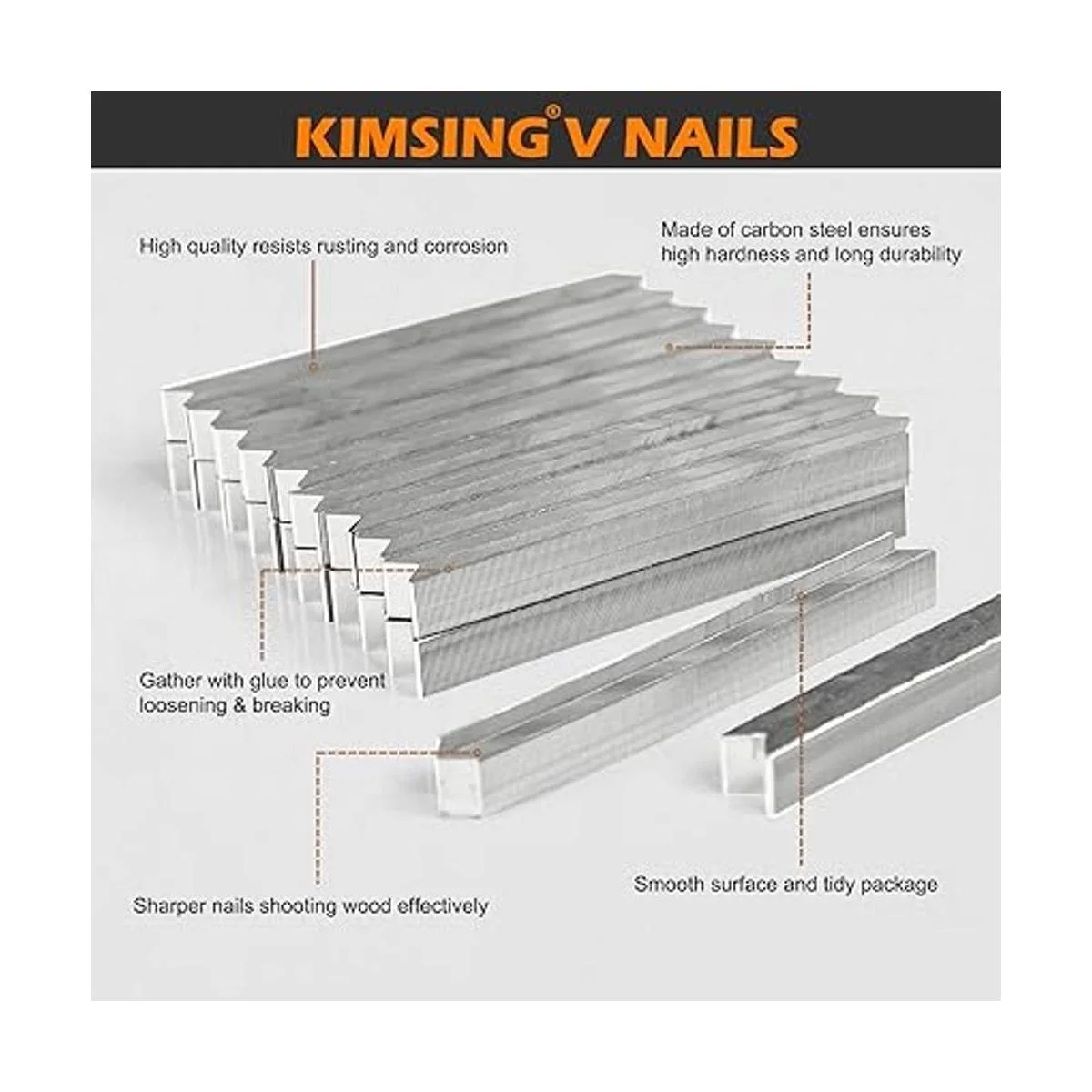 Calidad superior: hecho de acero al carbono para garantizar una alta dureza, resistencia a la tracción y penetración; superficie lisa, sin flash y anticorrosión. Menos atascos: lado de pegamento en las uñas para dirección de carga hacia arriba; reúne las uñas en V con pegamento para evitar que se afloje y se rompa. Embalado con una caja para una colocación ordenada