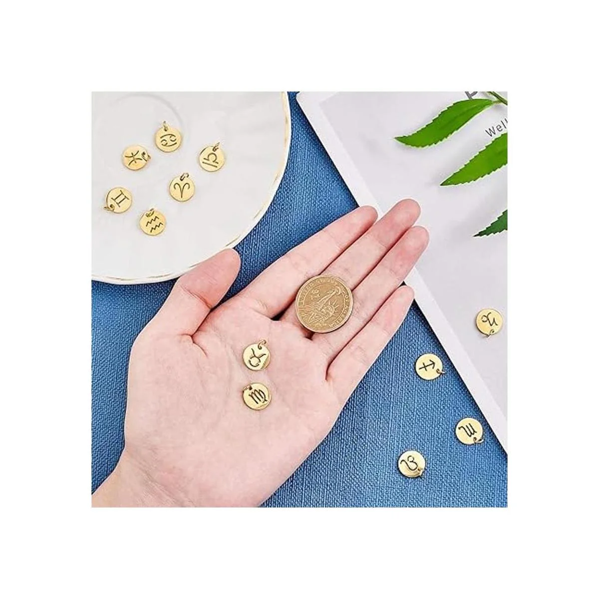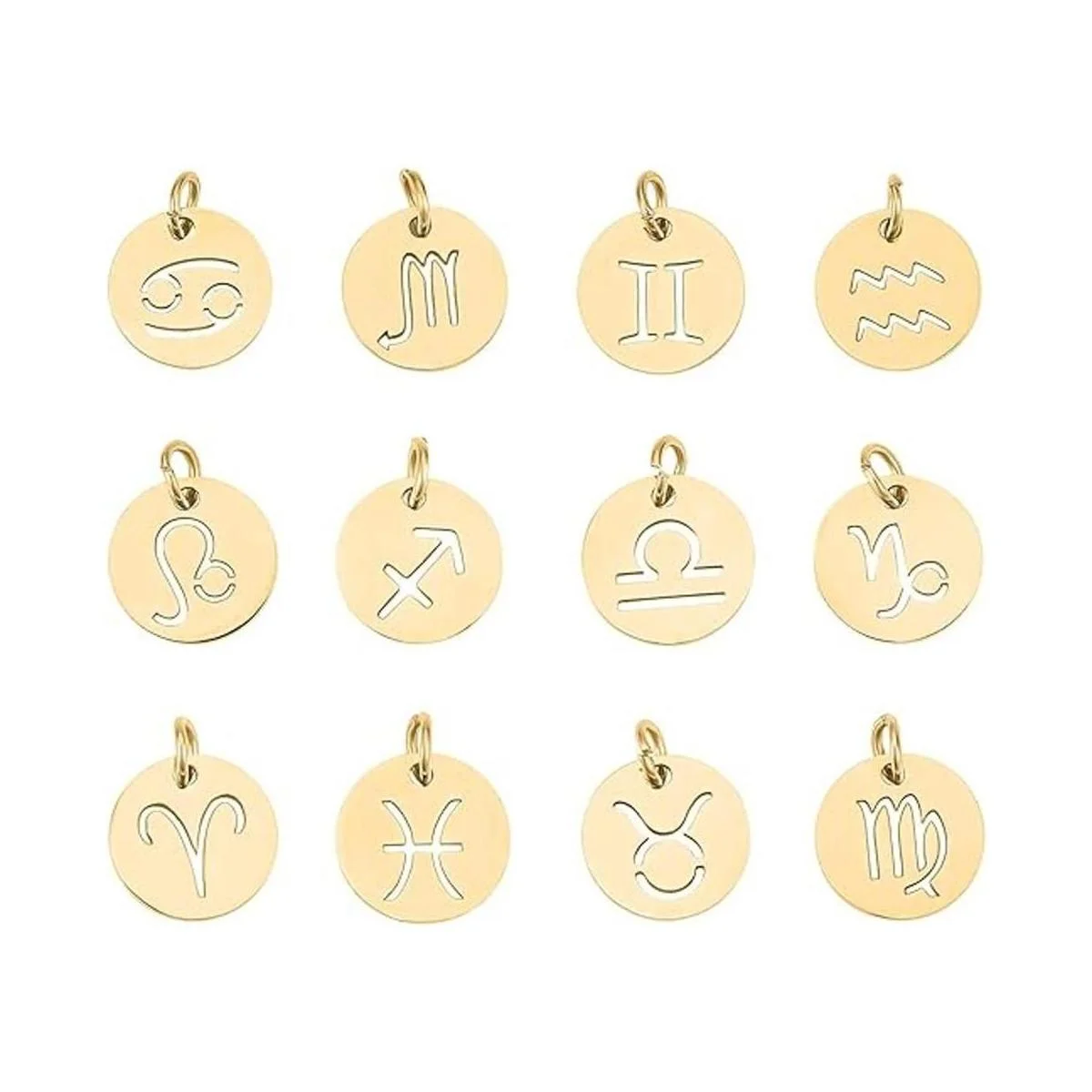 UNICRAFTALE 12 Constelaciones de acero inoxidable, 12 colgantes de signo del zodiaco de oro 0.118 in agujero plano redondo con constelación colgante para bricolaje joyería artesanía fabricación 0.472 in