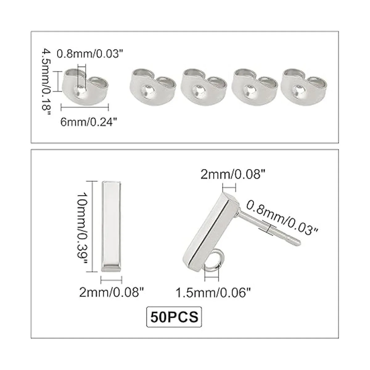 Tamaño y cantidad: viene con 50 accesorios de aretes de acero inoxidable con 50 tuercas de oreja, tamaño de aproximadamente 0.079 in de ancho, 0.394 in de largo, 0.079 in de grosor, agujero: 0.059 in, pin 0.031 in. Se adapta a la mayoría de las joyas, bueno para organizar en grupos.