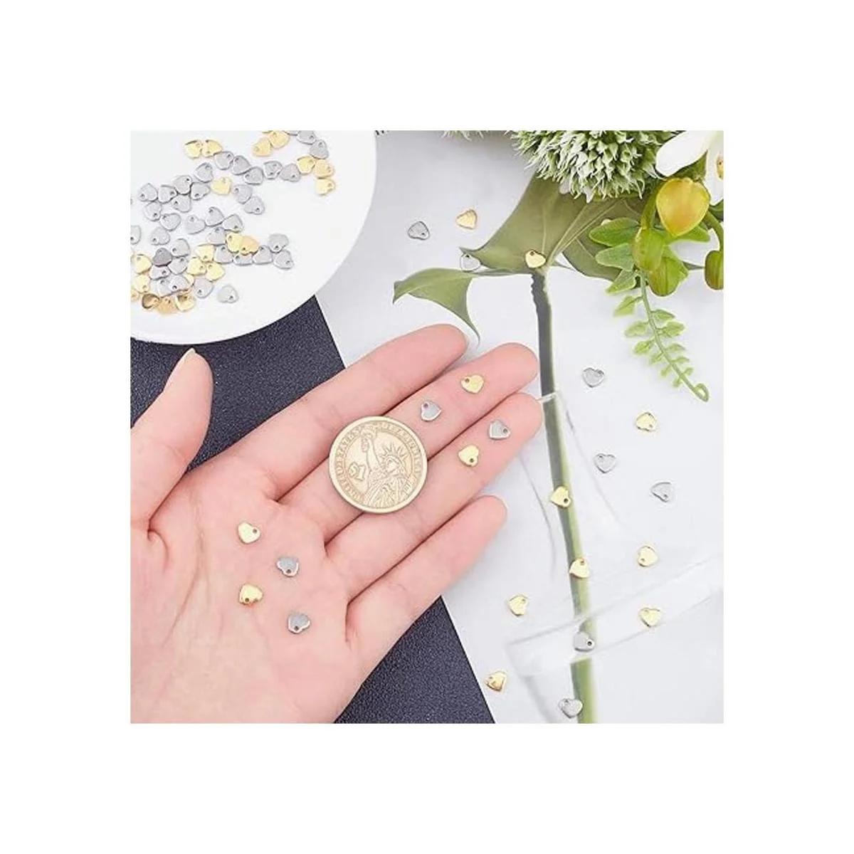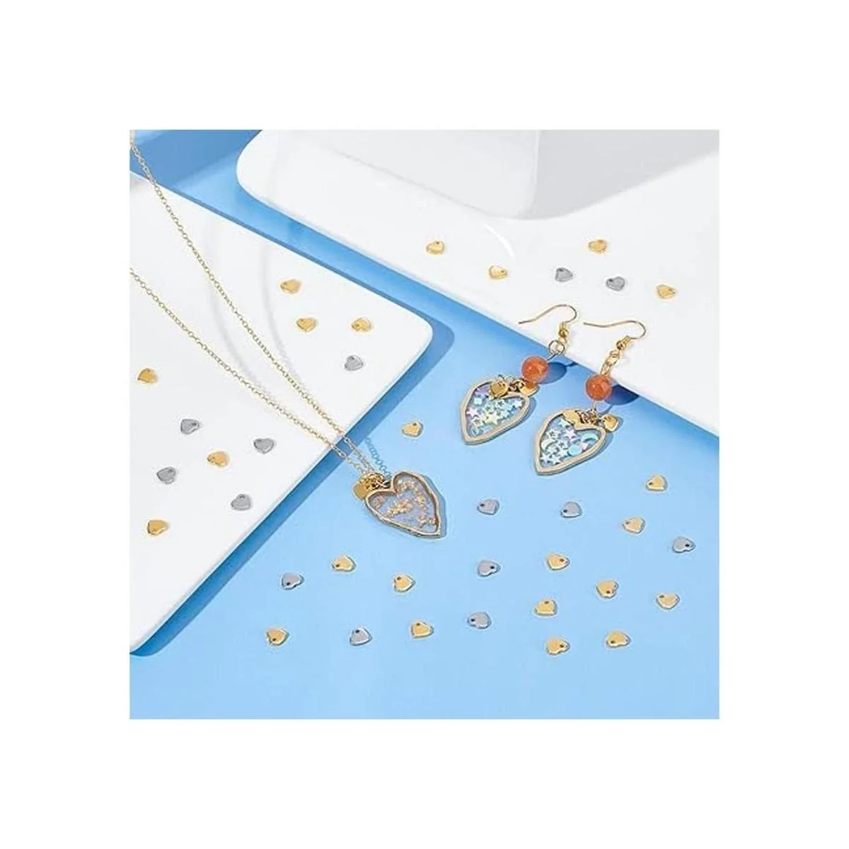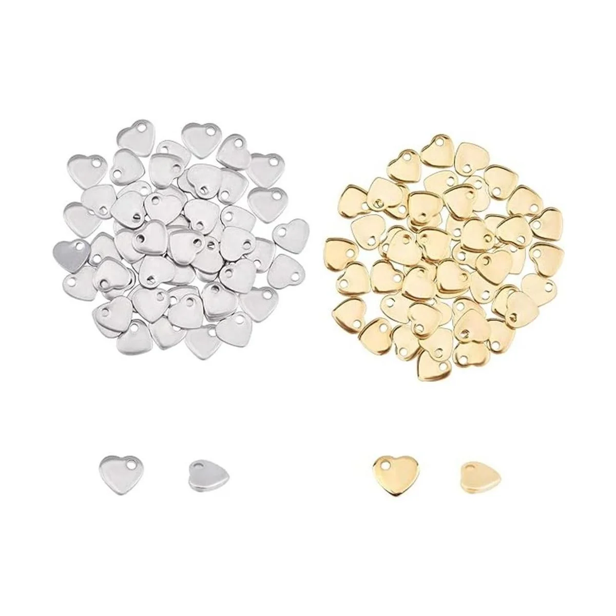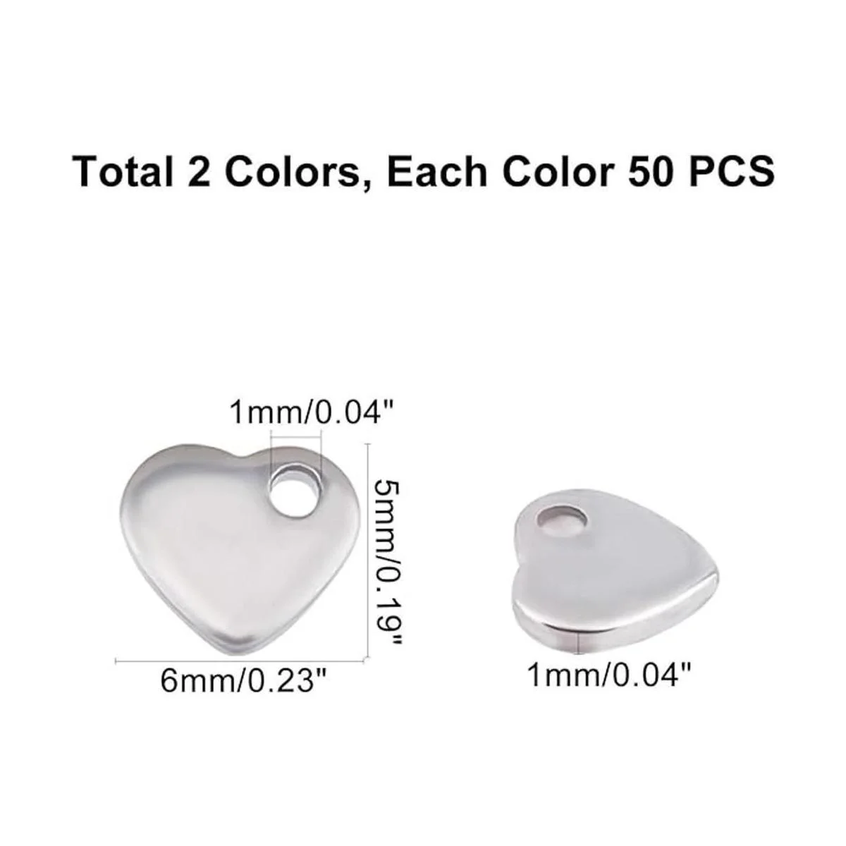 2 colores: el colgante con diseño de corazón contiene color dorado y acero inoxidable, cada color 50 piezas, alrededor de 100 piezas en total, alrededor de 0.197 in de largo, 0.236 in de ancho, 0.039 in de grosor, agujero: 0.039 in, agradable para tus joyas delicadas.