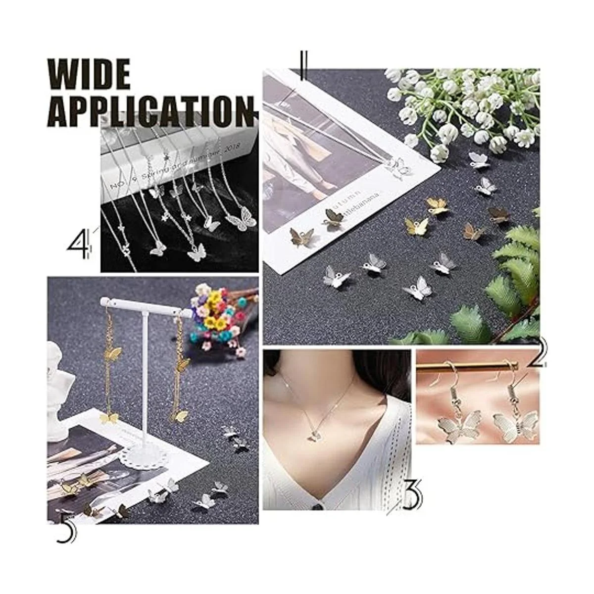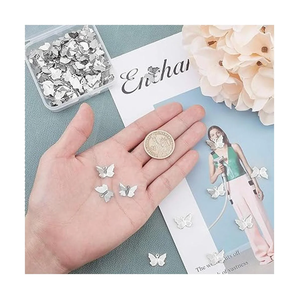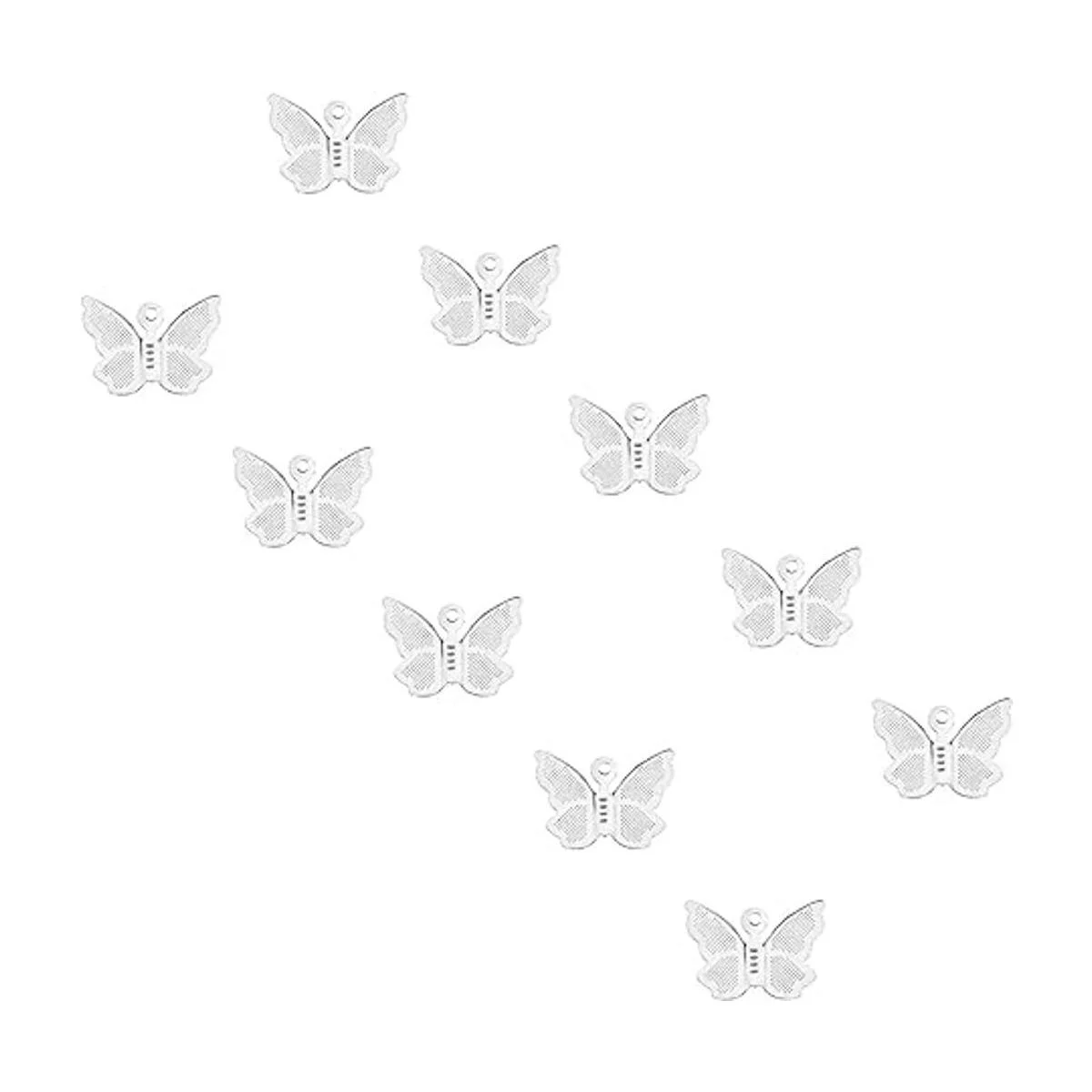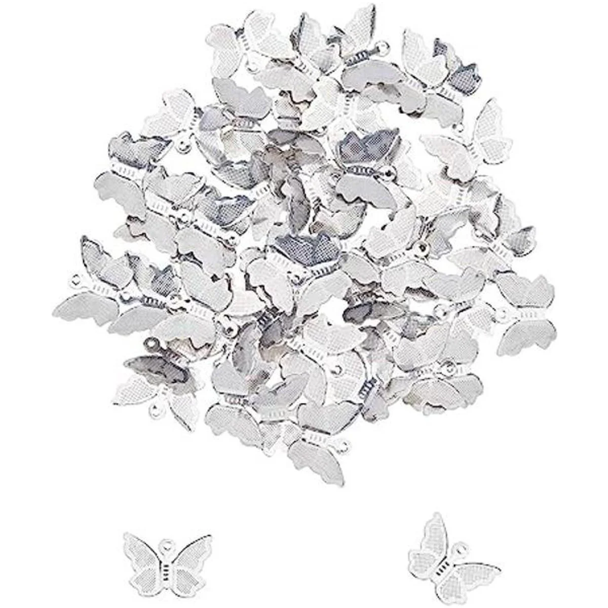 Especificaciones: abalorio: alrededor de 0.827 in de largo, 0.610 in de ancho, 0.118 in de grosor, agujero: 0.039 in. El paquete incluye: 100 colgantes de mariposa de acero inoxidable, suficientes para su uso diario y joyería de bricolaje.