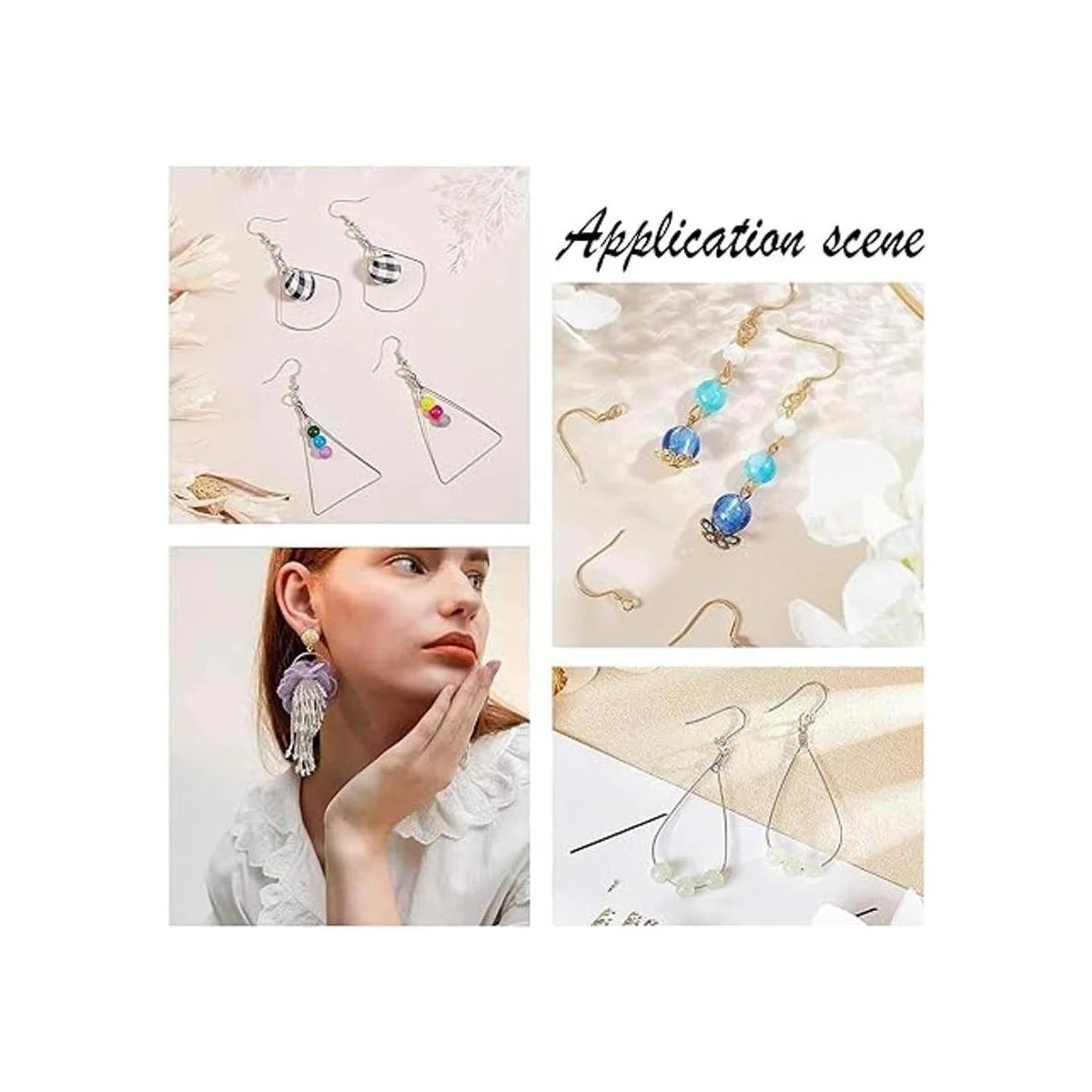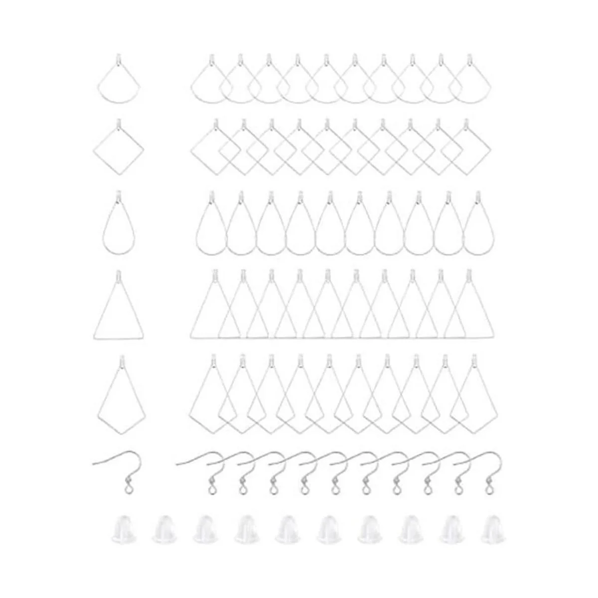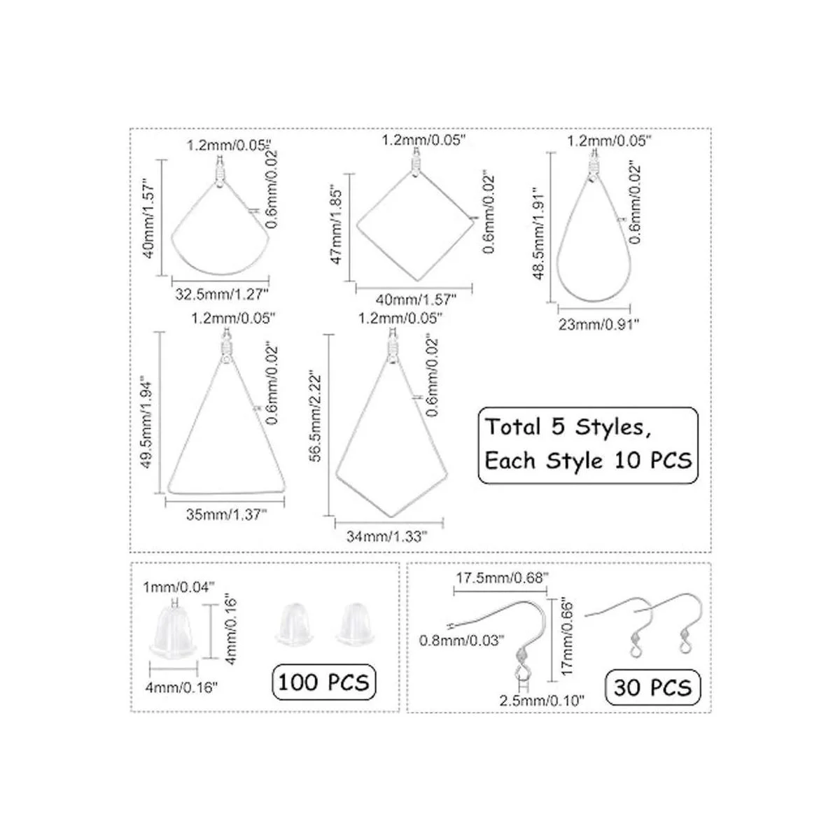 Colgante de alambre de 5 estilos: incluye forma de lágrima/cometa/rombo/abanico/triángulo, 10 piezas de cada estilo, 50 piezas en total, 30 ganchos para pendientes y 100 tuercas para orejas. Adecuado para varios pendientes de aro, suficiente para llevar y satisfacer tus diferentes necesidades en la vida cotidiana.