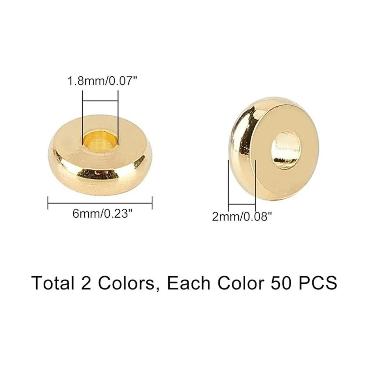 2 colores: acero inoxidable y color dorado, están disponibles en tamaño de aproximadamente 0.236 in de diámetro, 0.079 in de grosor, agujero: 0.071 in. Cada color 50 unidades, 100 unidades, fácil de almacenar y transportar. Adecuado para tu uso diario y proyectos de bricolaje.