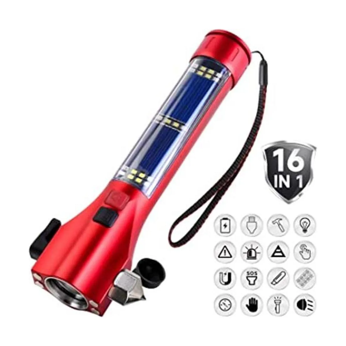 Kit de emergencia multifuncional: linterna de emergencia para coche todo en 1, incluye: interruptor de ventana, cortador de cinturón de seguridad, parpadeo SOS rojo y azul, rescate de alarma de 3 modos, carga solar, linterna LED de 3 modos, 2 modos de luz lateral, carga USB, banco de energía móvil, potente imán, diseño portátil.