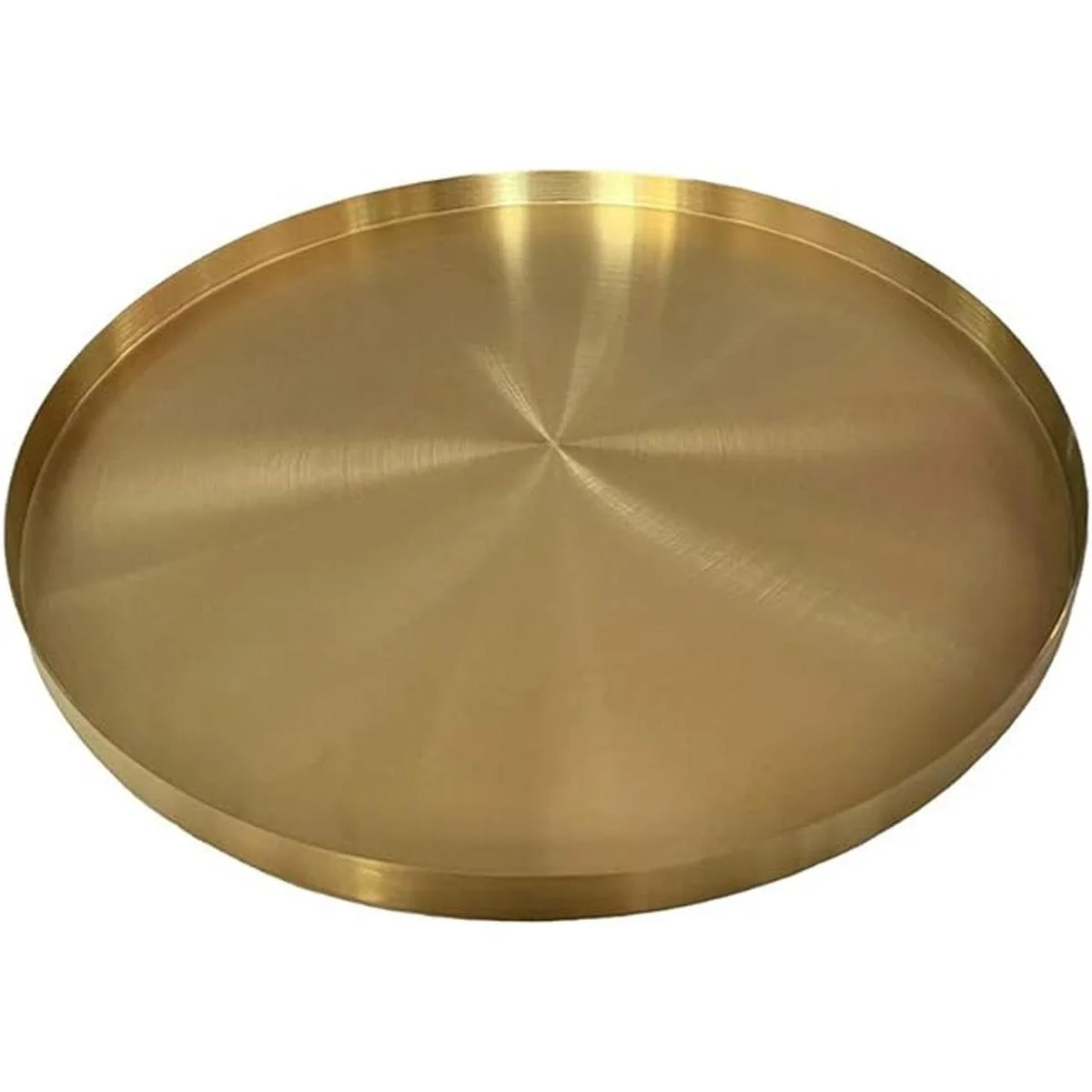 Esta bandeja redonda está hecha de acero inoxidable con acabado de latón cepillado.