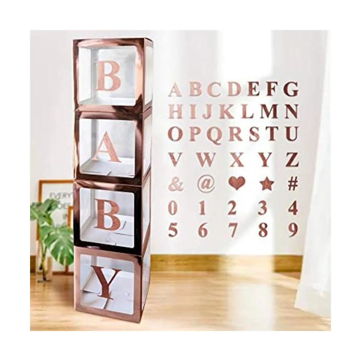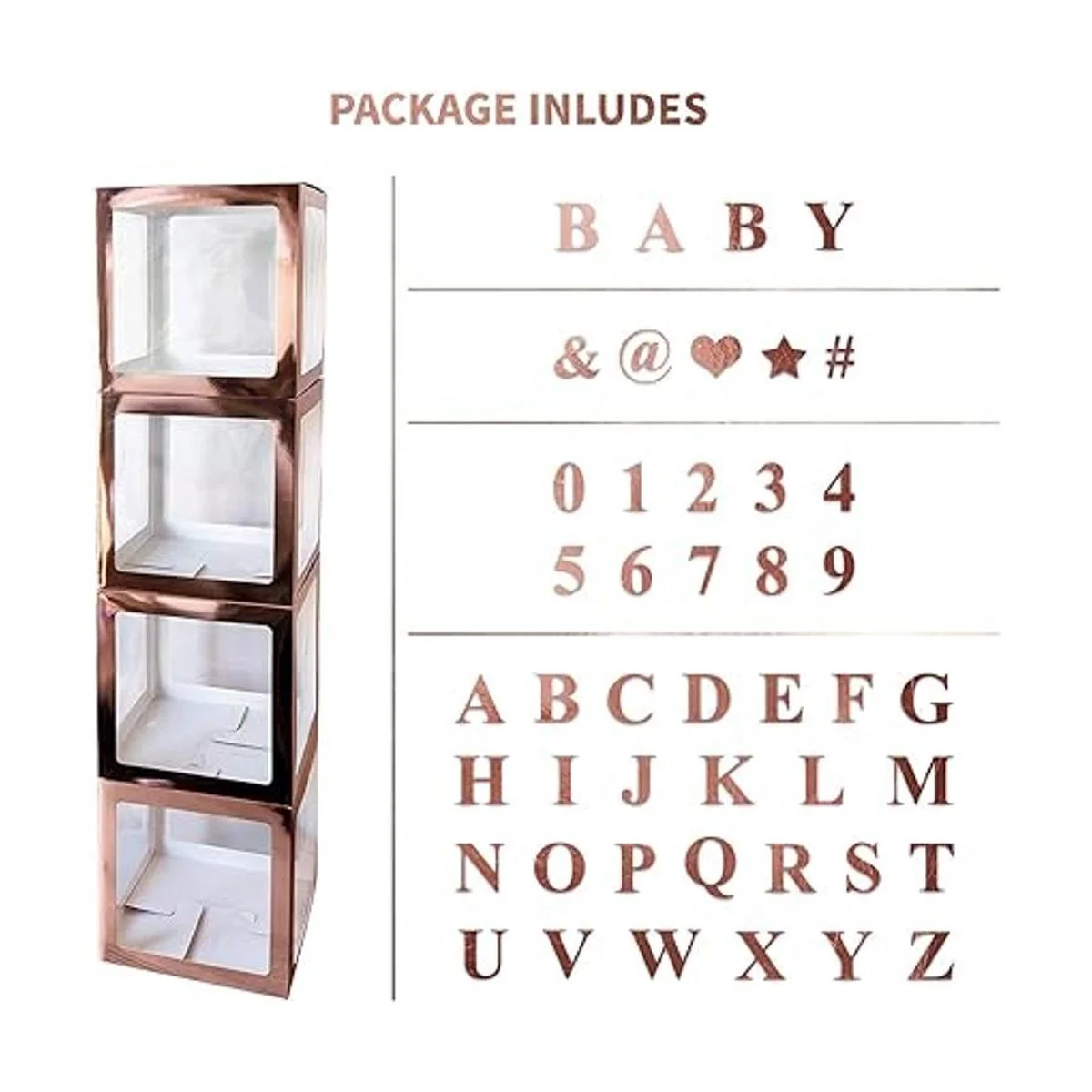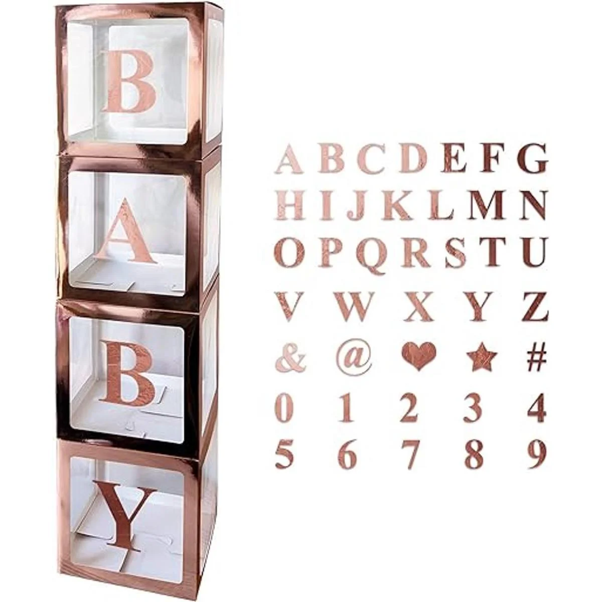 Paquete: 4 cajas plegables de oro rosa, 30 letras, 10 números, 5 símbolos. 30 letras incluyen letras B A B Y, letras A a Z. 10 números incluyen 0 a 9 números. 5 símbolos incluyen forma de corazón, forma de estrella, , , .
