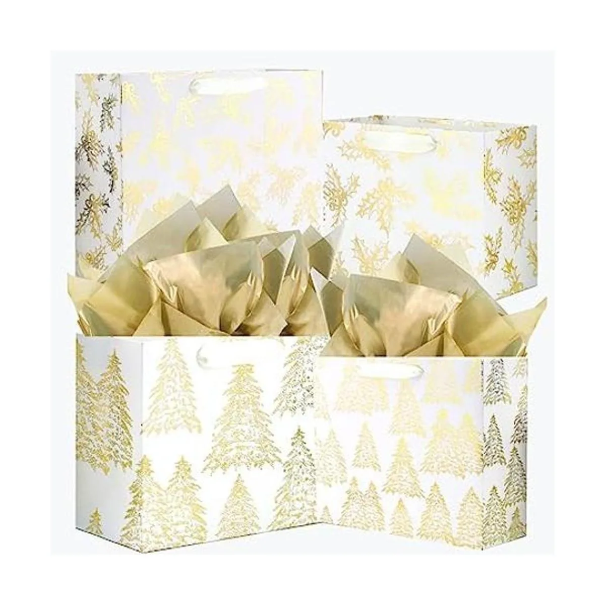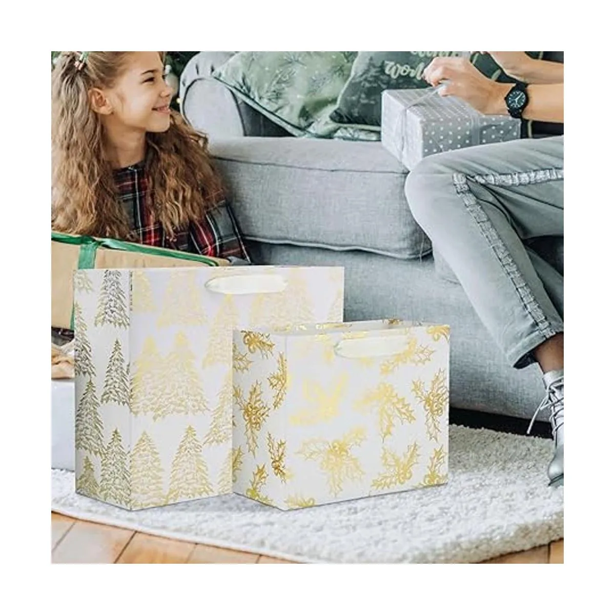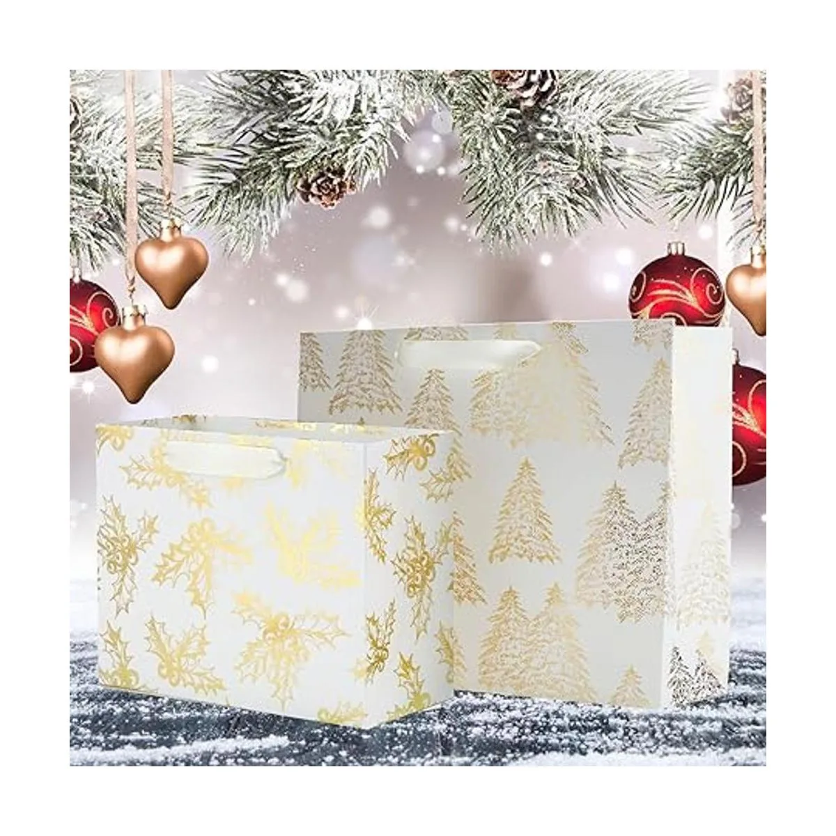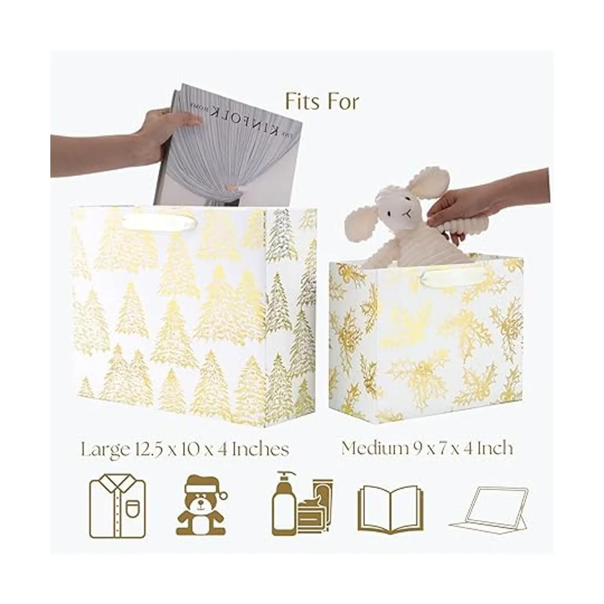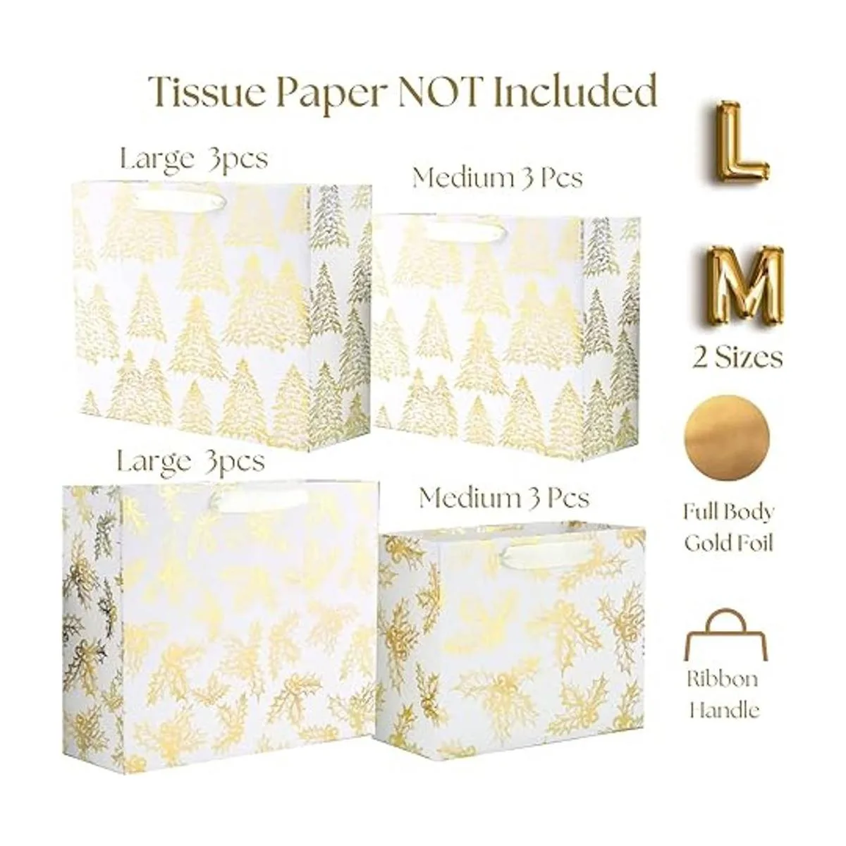 Lujosas bolsas de regalo doradas. Varios tamaños y diseños. Juego de 12, acabado dorado metálico de cuerpo completo. Patrones de árbol de Navidad y muérdago. 6 piezas grandes de 12.5 x 10 x 4 pulgadas, 6 piezas medianas de 9 x 7 x 4 pulgadas, emparejadas con asas de cinta marfil. Tamaño para suéteres, camisas, revistas, juguetes, libros, velas, ropa, bufanda, guantes y camisas. No se necesita envoltorio de regalo.
