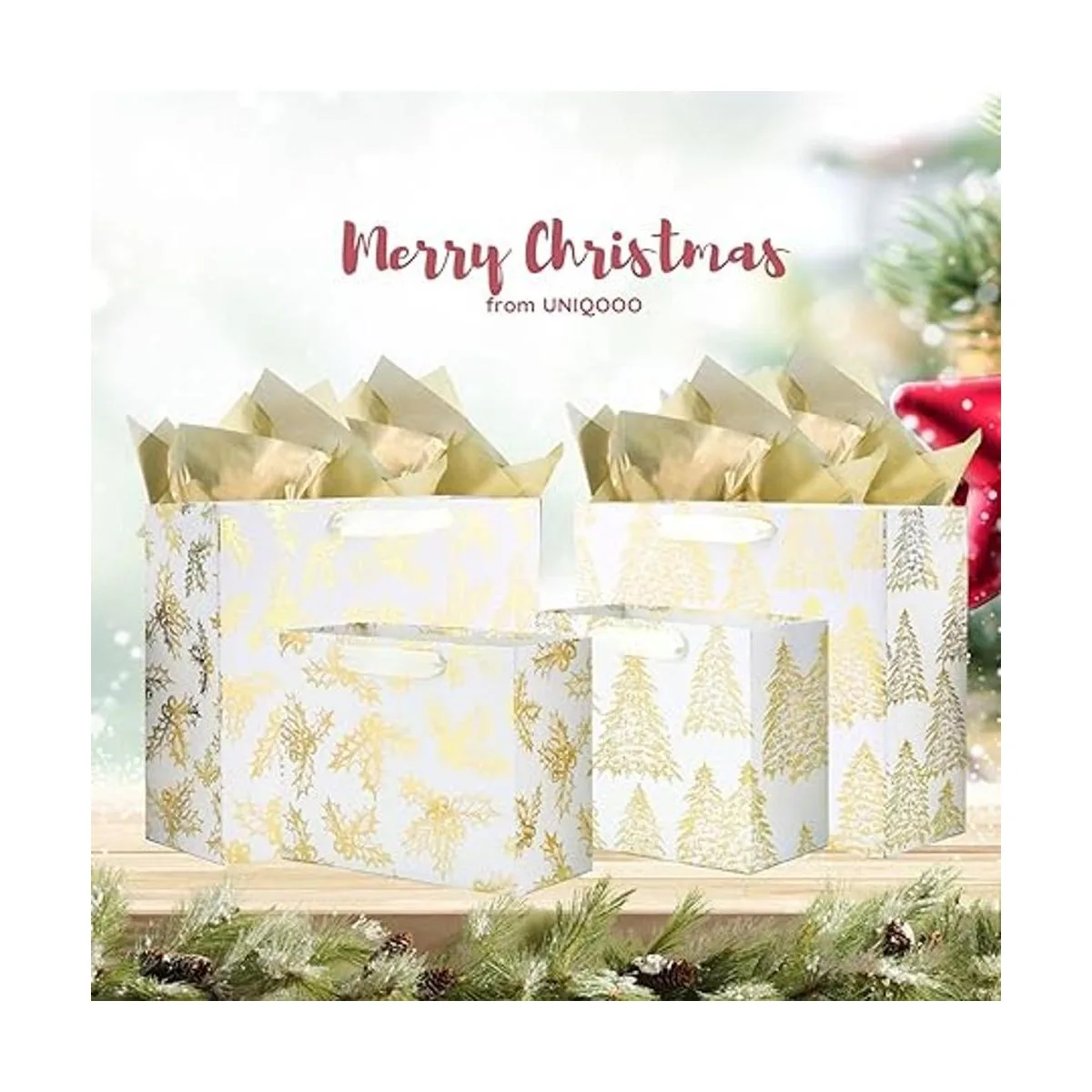 UNIQOOO 12 bolsas de regalo de Navidad doradas metálicas surtidas, tamaño L 12.5 pulgadas M 9 pulgadas, bolsas de regalo doradas para árbol de Navidad, bolsa de regalo de muérdago dorado, embalaje de regalo para Acción de Gracias, vacaciones de Año Nuevo