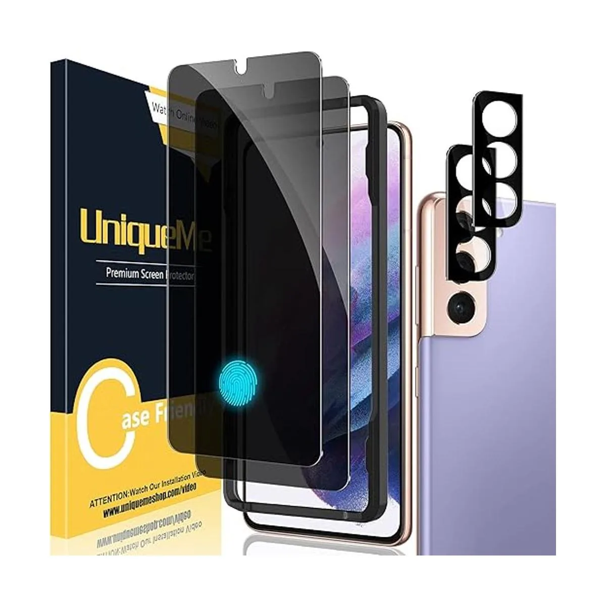 UniqueMe Paquete de 2 2 unidades compatible con Samsung Galaxy S21 Plus de 6.7 pulgadas, protector de pantalla de privacidad y protector de lente de cámara, compatible con desbloqueo de huellas dactilares, con herramientas de fácil instalación, no vidrio. Dureza 7H