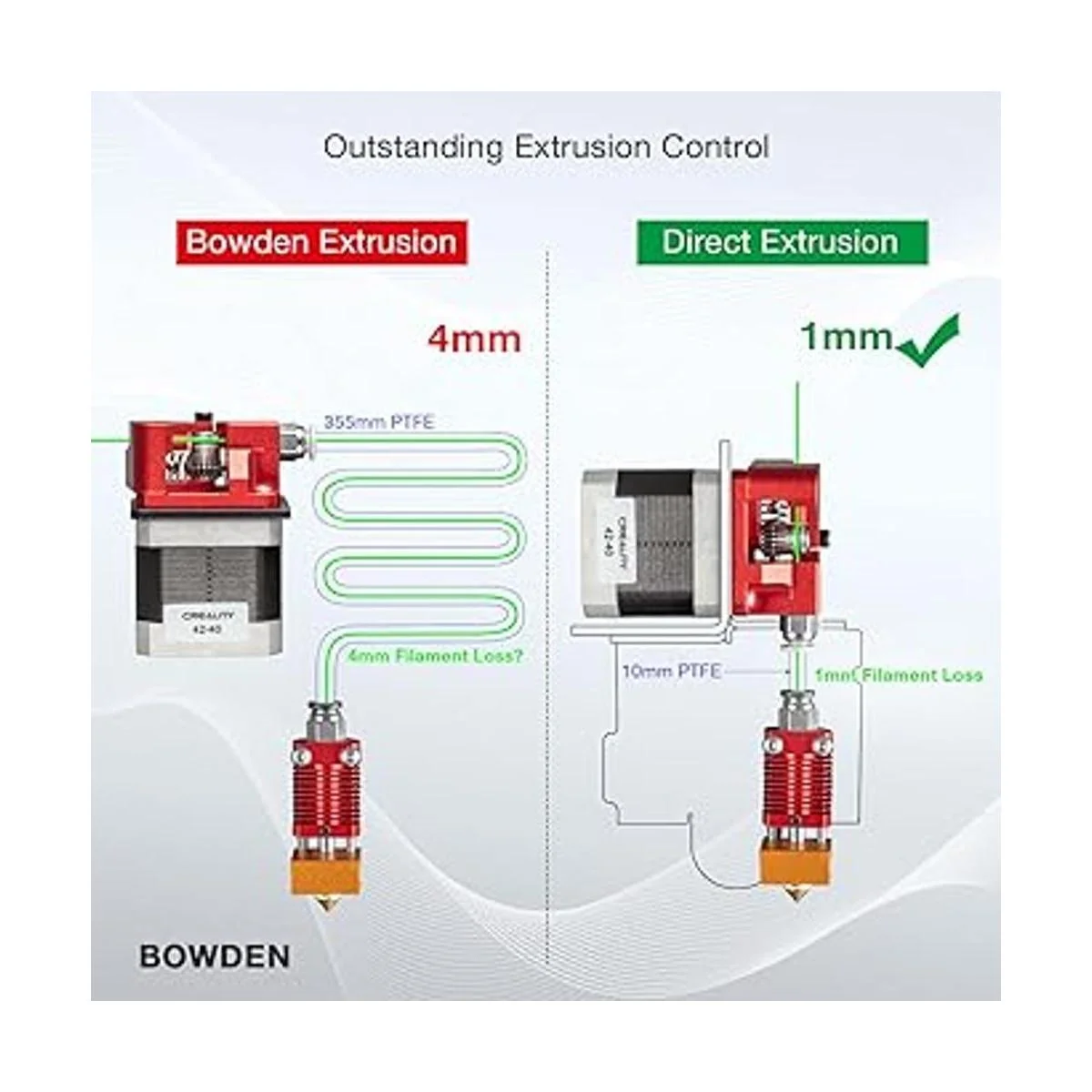 Excelente control de extrusión: un extrusor de accionamiento directo mejora la extrusión y la retracción eliminando la necesidad del tubo Bowden PTFE. Proporciona una retracción precisa y un mejor resultado de impresión.