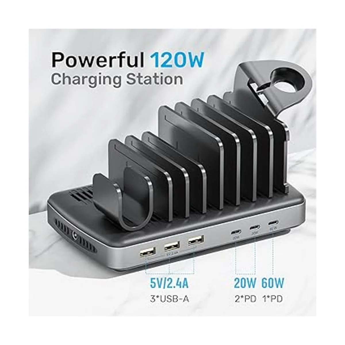 Unitek Estación de carga USB para múltiples dispositivos Apple, base de carga de 120 W 6 puertos con PD tipo C 20 W y PD 60 W, soporte de carga rápida con reloj inteligente y soporte para Airpods para iPhone, iPad, tabletas, MacBook