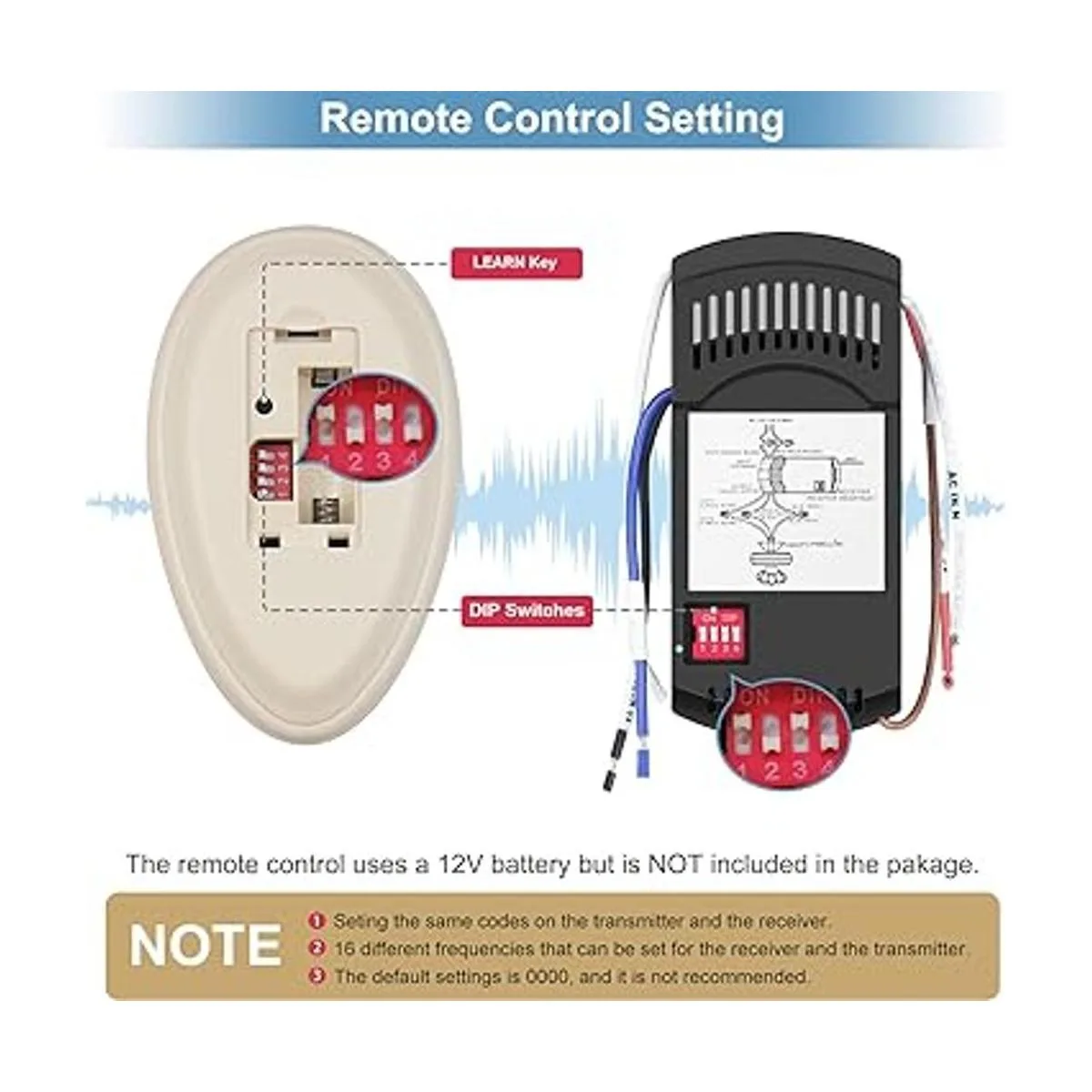 Easy to Set the Dip Switches and Connect to the Motor Matching dip switch for the transmitter and receiver: Look inside the old remote with the battery cover off. There is a series of DIP switches4 with a pen, slide the switches in the new remote to match the same pattern as the old remote. Replace the battery in the new remote and things should work well.The ceiling fan receiver wires are labelled, and the wires all have the correct color codes.