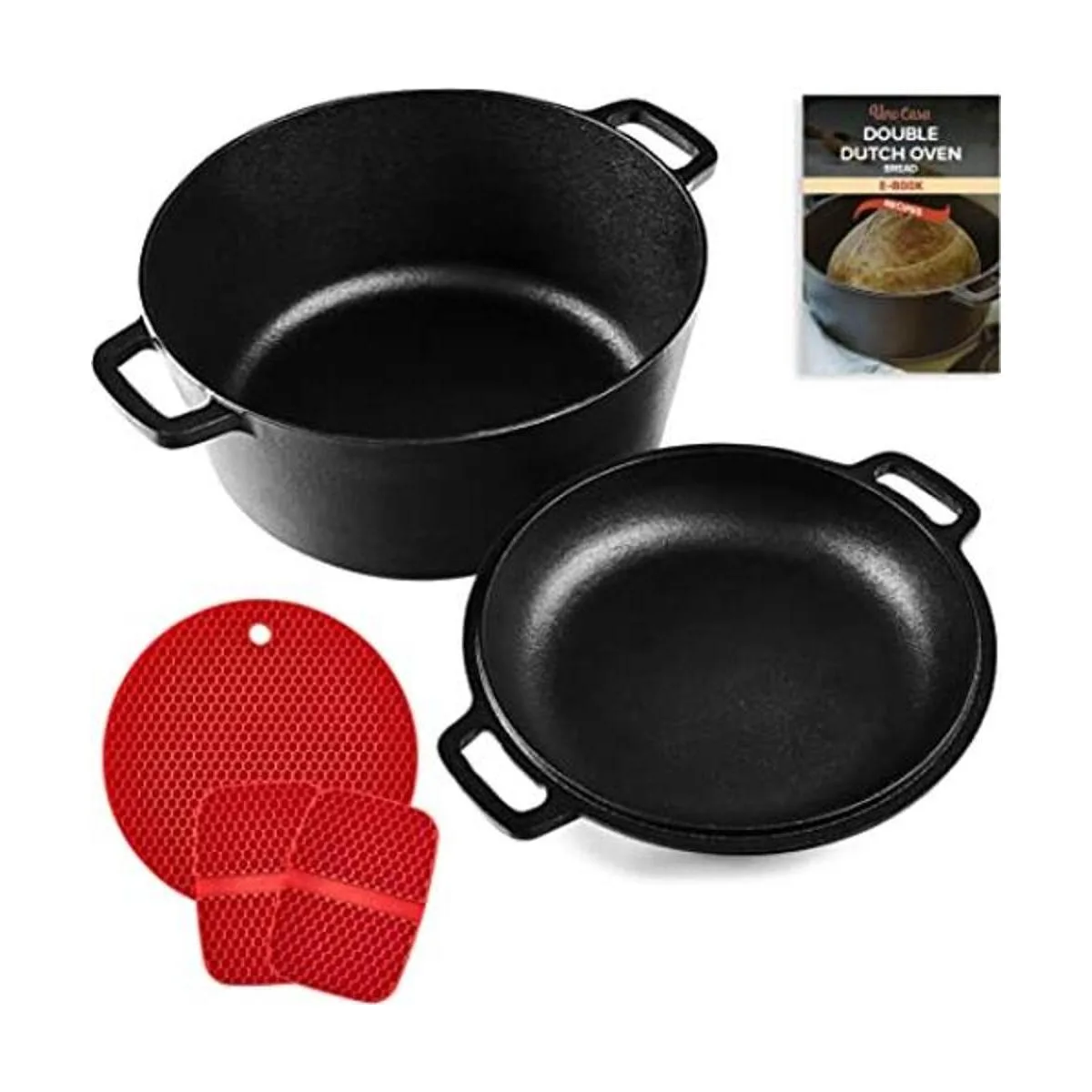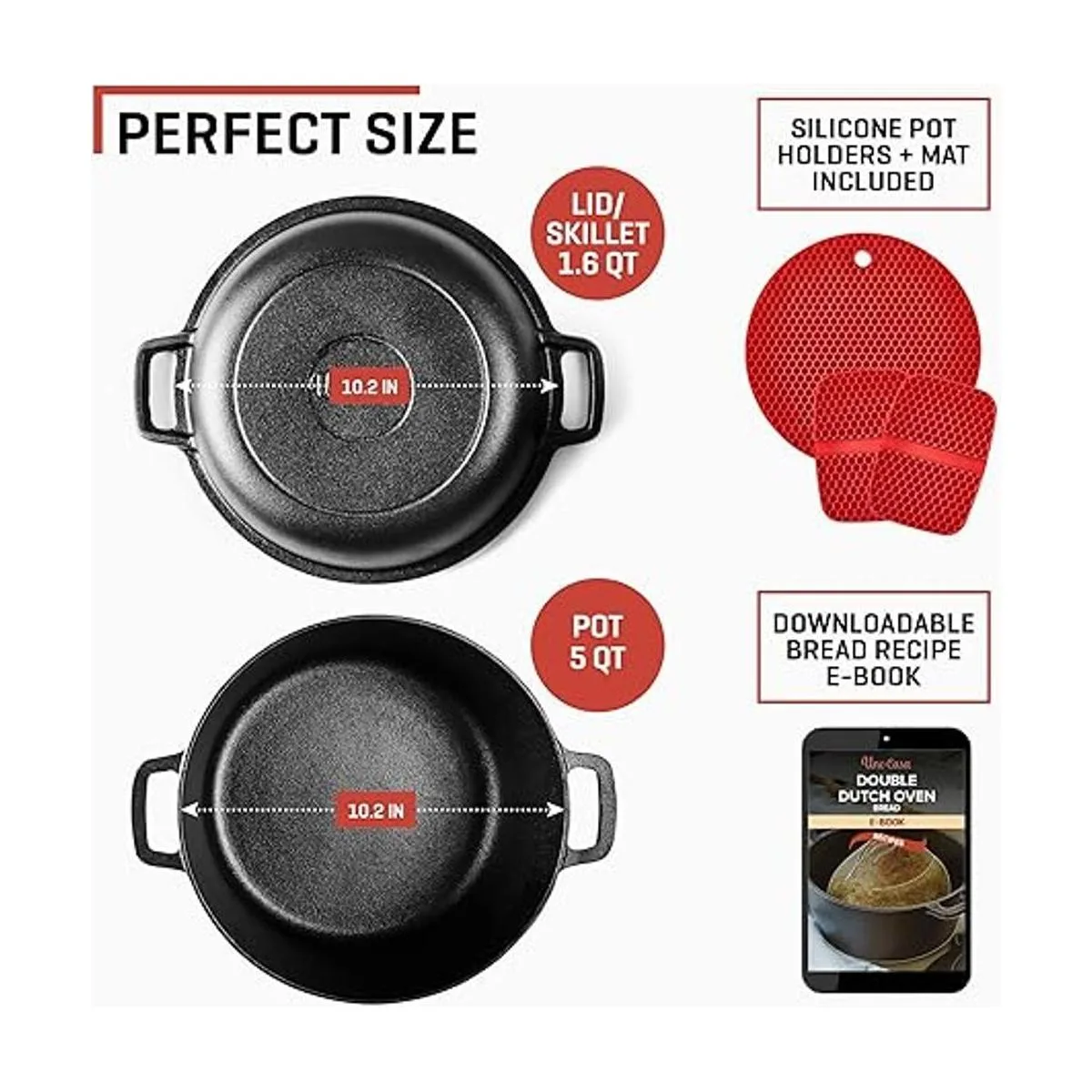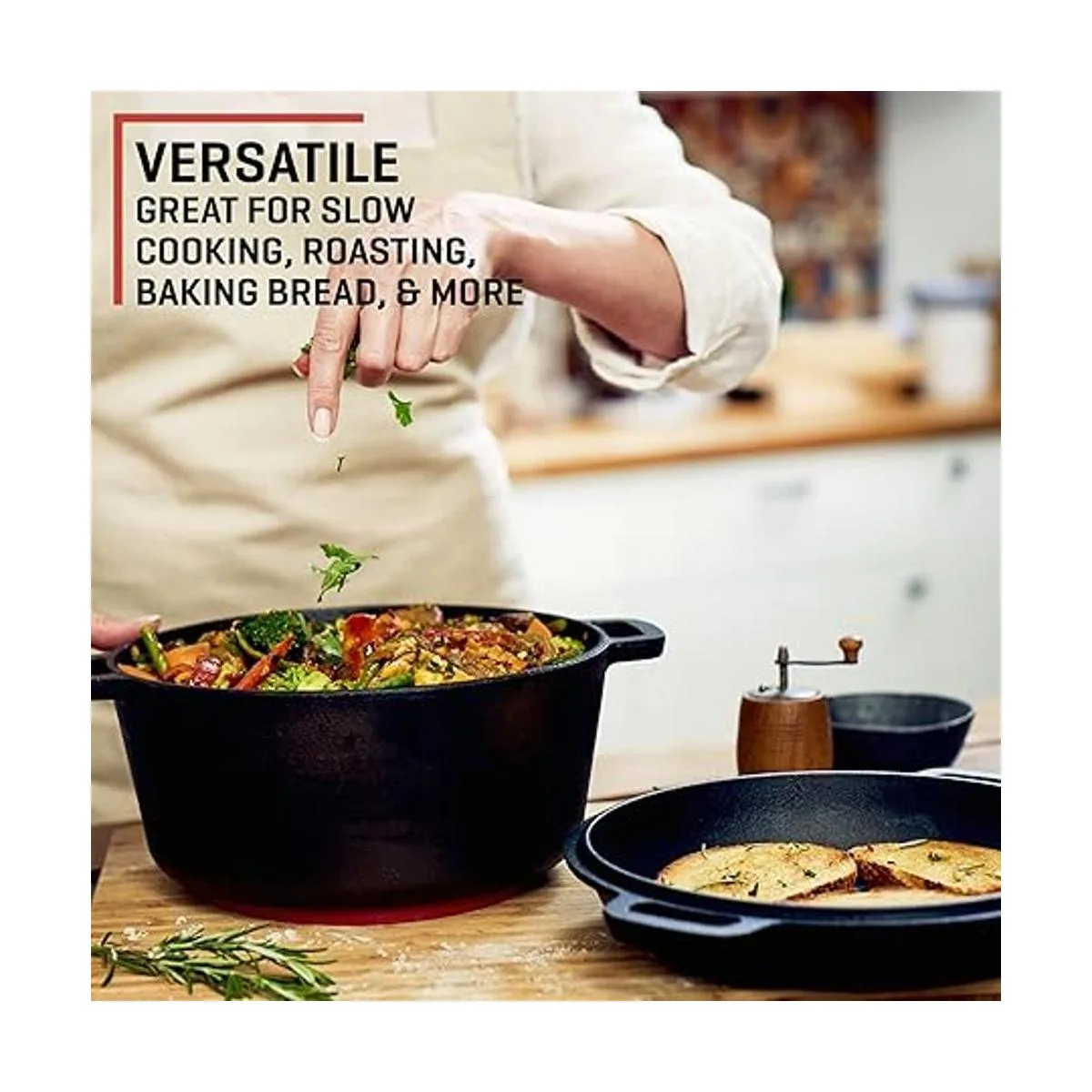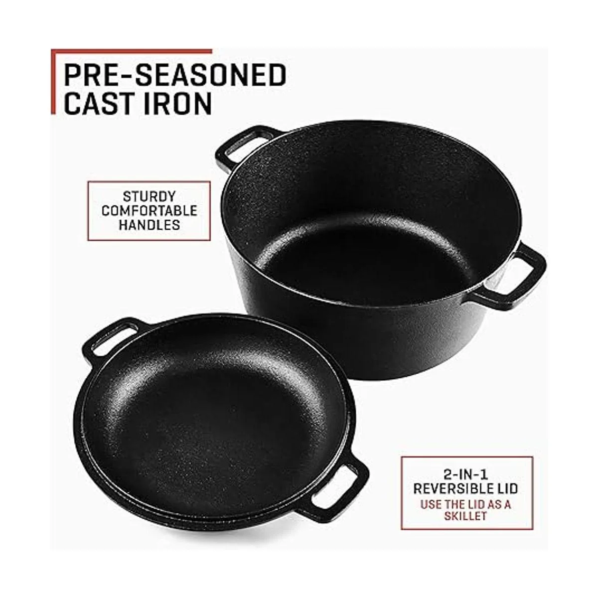 Uno Casa Horno holandés de hierro fundido 2 en 1 Olla holandesa de 5 cuartos con tapa, hierro fundido, horno holandés de hierro fundido presazonado, 5 cuartos con sartén, olla de hierro fundido