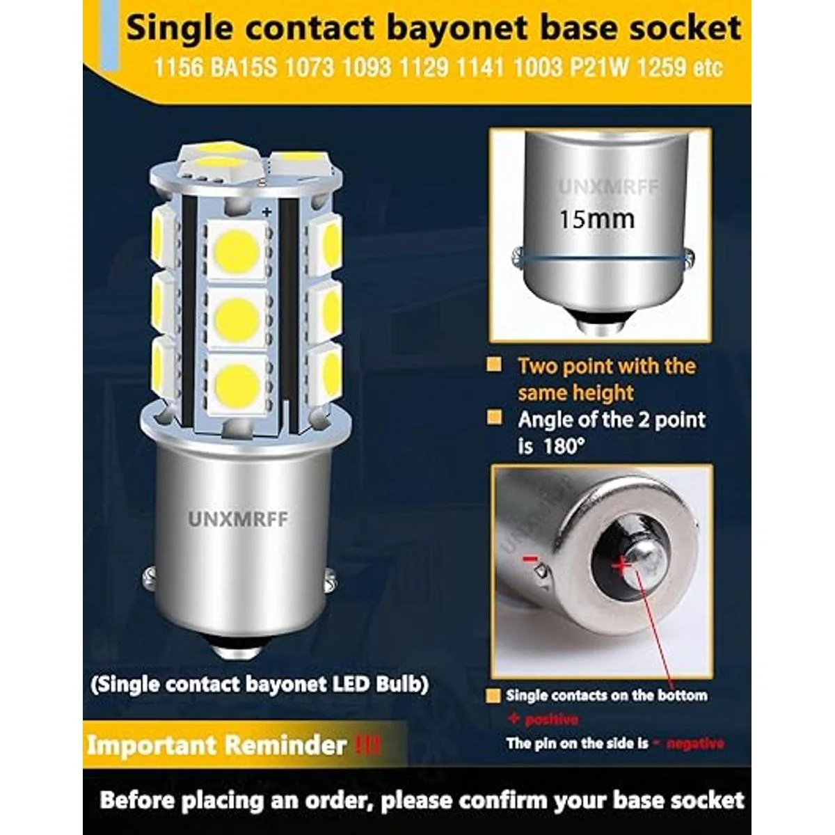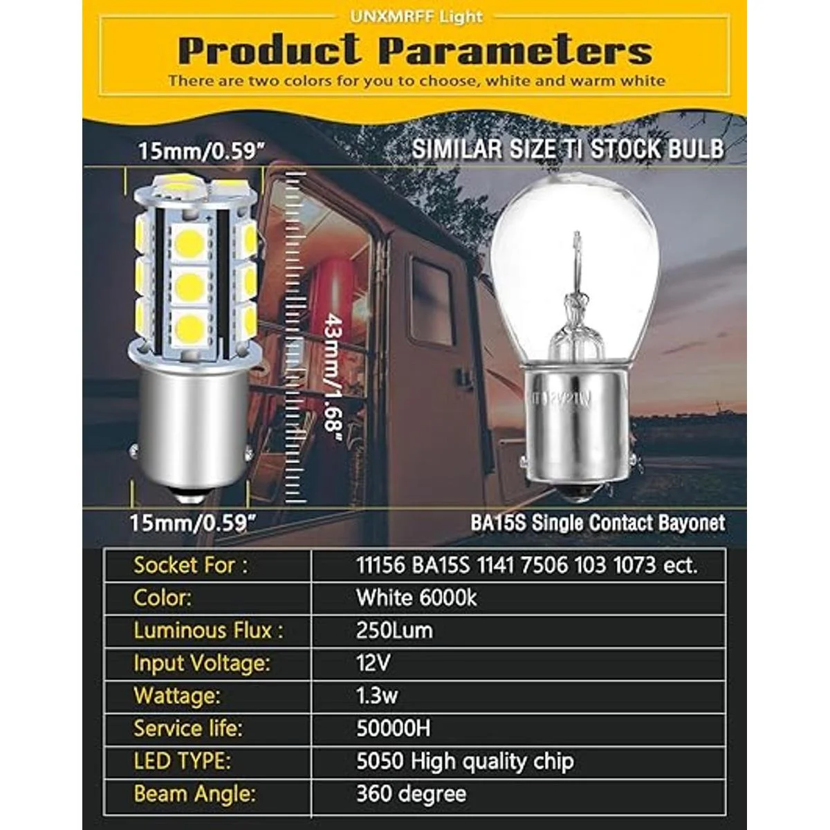 Amplia aplicación: foco LED BA15S comúnmente utilizado para bombillas de caravana, bombillas de luz de caravana, bombillas de luz LED 1141, luces de marcha atrás, luces de estacionamiento, luces de giro, luces de remolque, lancha, casa rodante, motocicleta y coche, tractor de césped, etc.