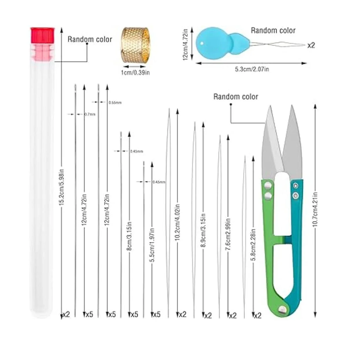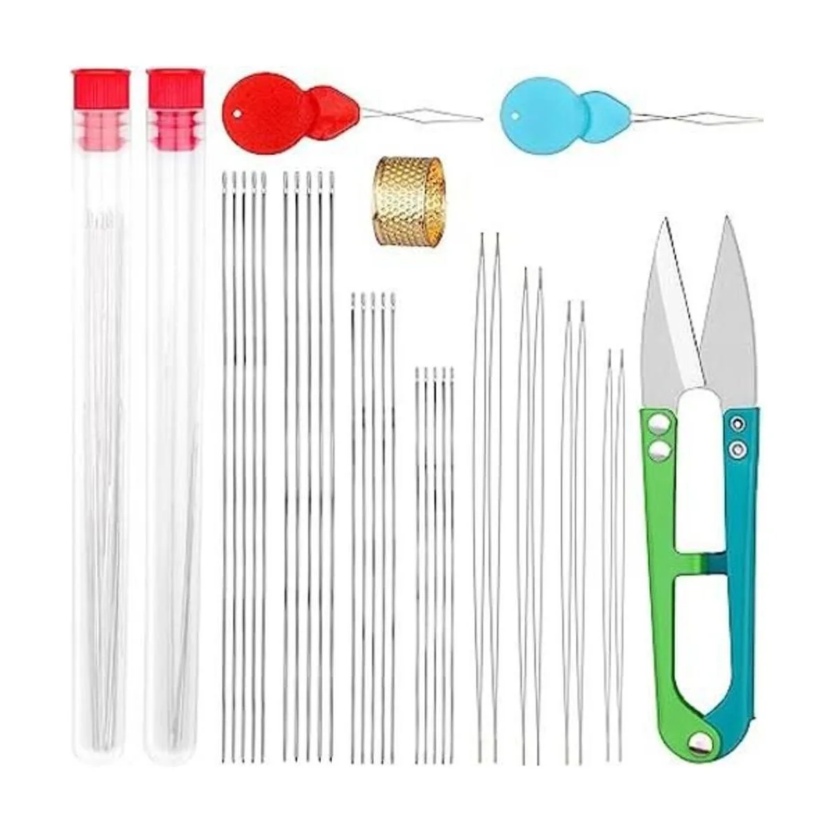 Recibirás 34 piezas en total: 20 agujas largas de hilo recto, 8 agujas de bordado de cuentas de ojo grande, 1 dedal, 2 botellas de aguja color aleatorio, 2 enhebradores de aguja color aleatorio, 1 tijeras de hilo. Es un juego de agujas de cuentas muy práctico, puedes utilizar este juego de agujas de cuentas para hacer algunos proyectos de manualidades.