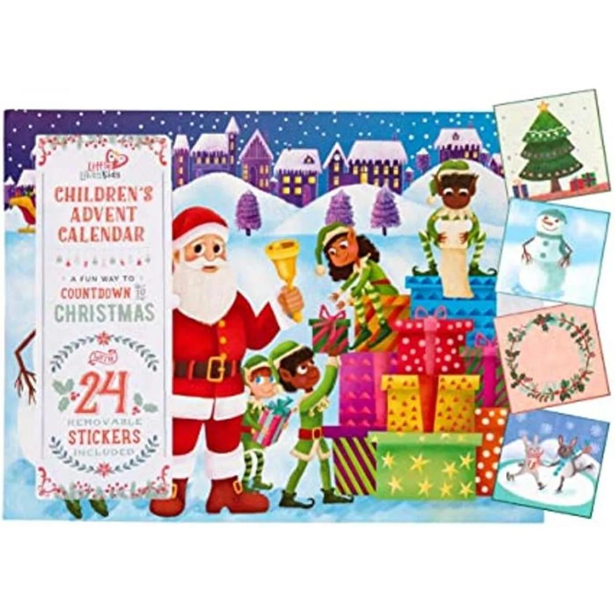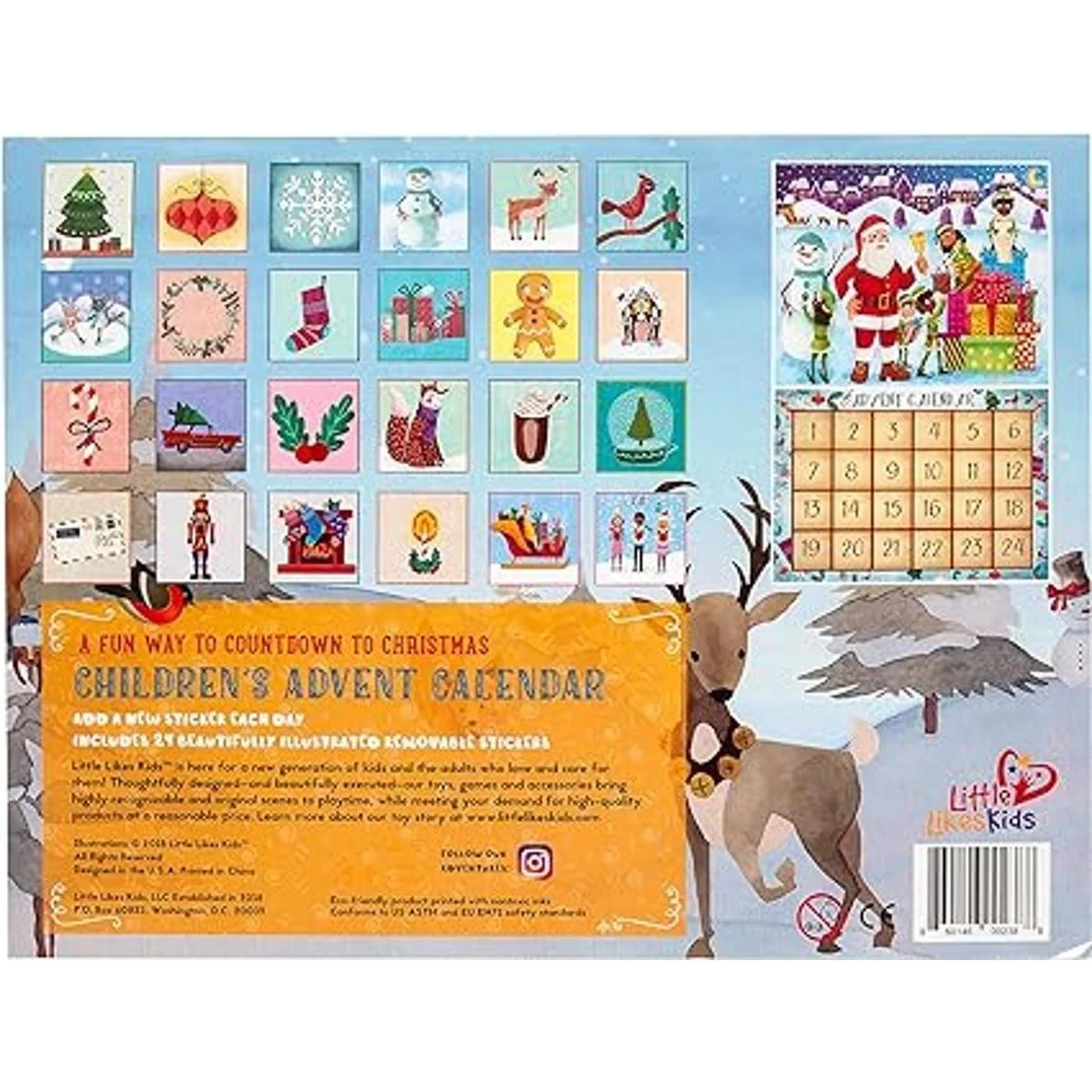Especificaciones del producto: cada paquete contiene 1 calendario de Adviento infantil Little Likes Kids con Papá Noel caucásico y 1 hoja de 24 calcomanías individuales con temática navideña.