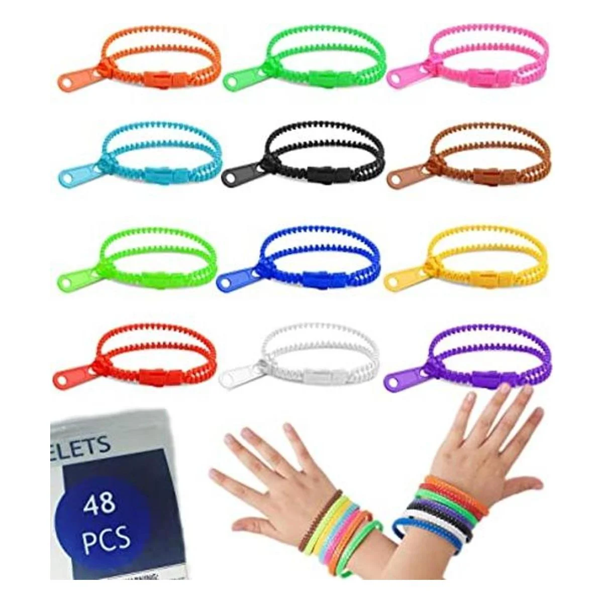 UpBrands Paquete de 48 pulseras sensoriales con cremallera, un excelente kit para regalos de fiesta de cumpleaños para niños. Son un juguete de fiesta muy popular para la fiesta de cumpleaños de tu hijo. Los niños jugarán con estas pulseras de plástico y les encantará compartirlas en bolsas de golosinas. Gran juguete sensorial para aliviar el estrés para niños con necesidades especiales. Perfecto para matar el tiempo, antiestrés, mejor enfoque, TDAH o niños autistas.