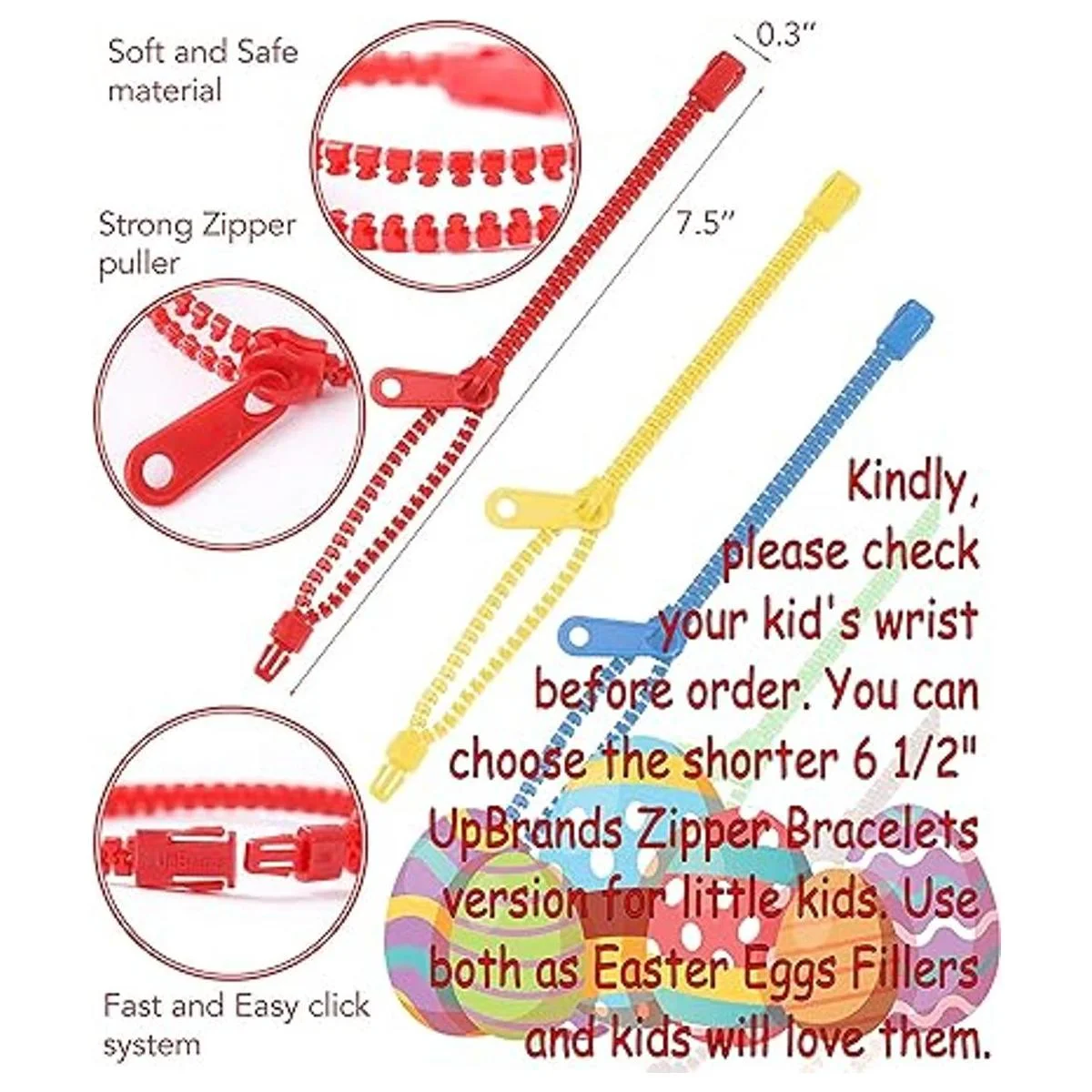 Cada pulsera con cremallera mide 7.5 pulgadas, que es lo suficientemente larga incluso para adultos. Las pulseras están empaquetadas en una bolsa con cremallera altamente resistente. UpBrands Fidget Zipper Bracelets 48 Pack viene en una amplia variedad de colores brillantes y vivos.
