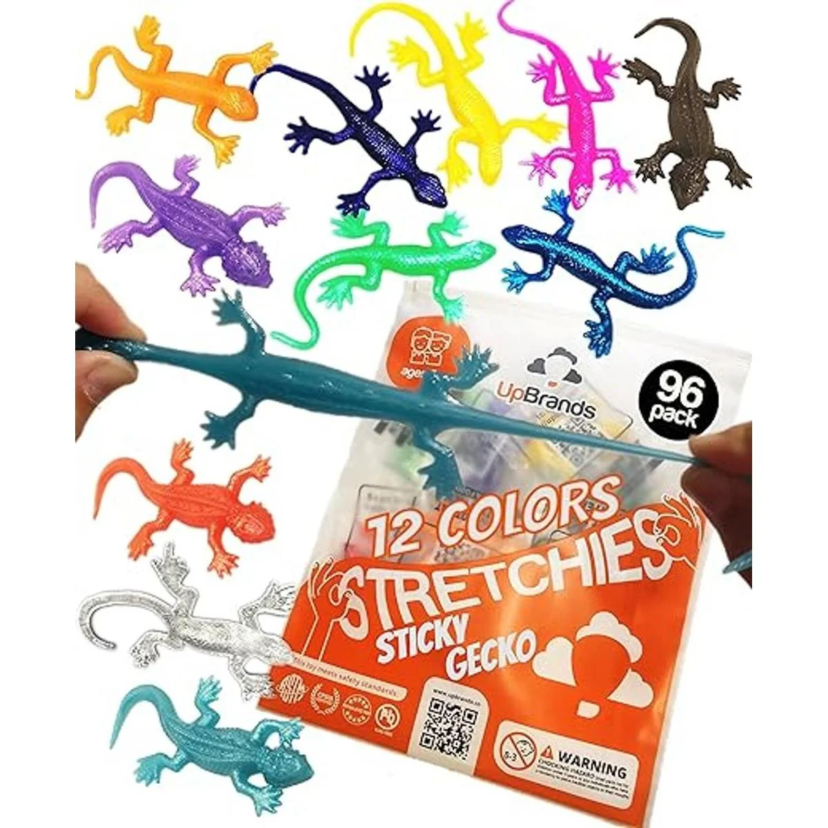 UpBrands 96 juguetes de lagartos súper elásticos de 3 pulgadas, 12 colores con purpurina, kit para recuerdos de fiesta de cumpleaños para niños, bolsas de golosinas, rellenos de cesta de huevos de Pascua, relleno de piñata, premios de aula