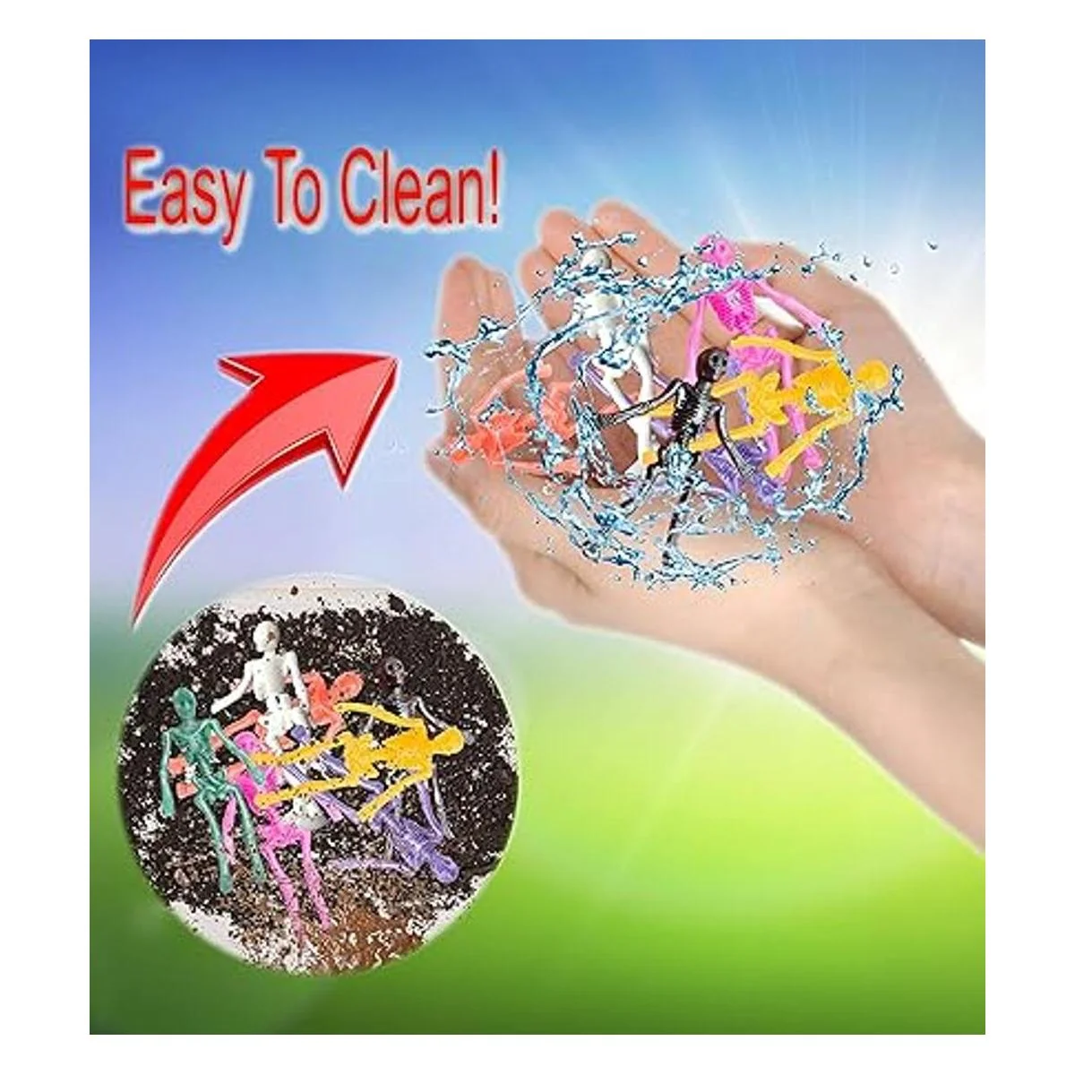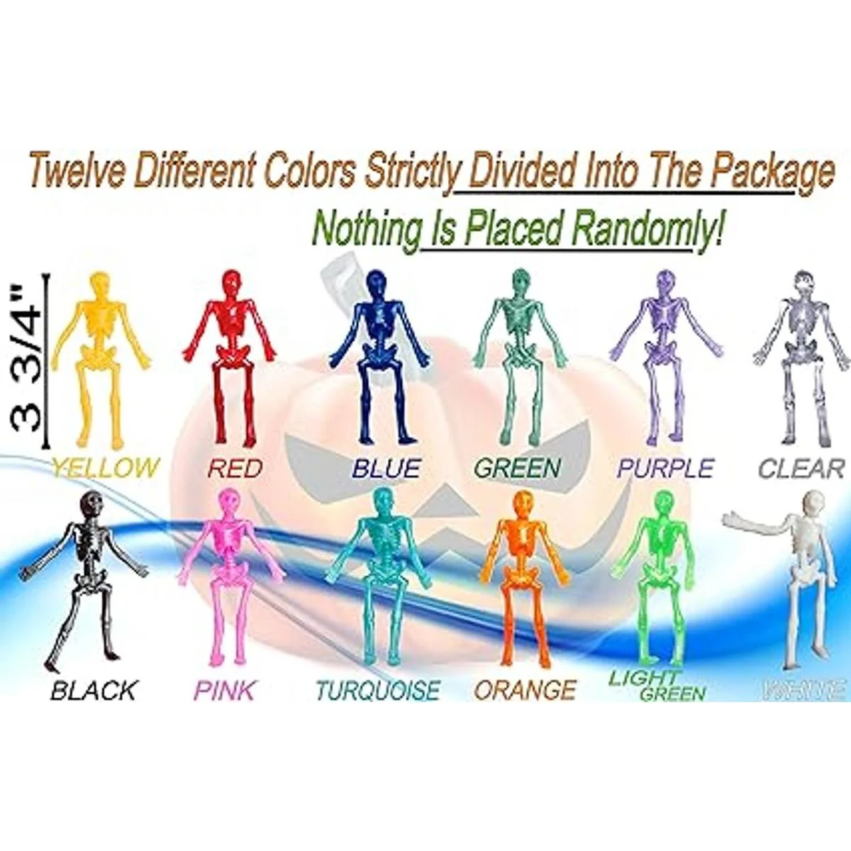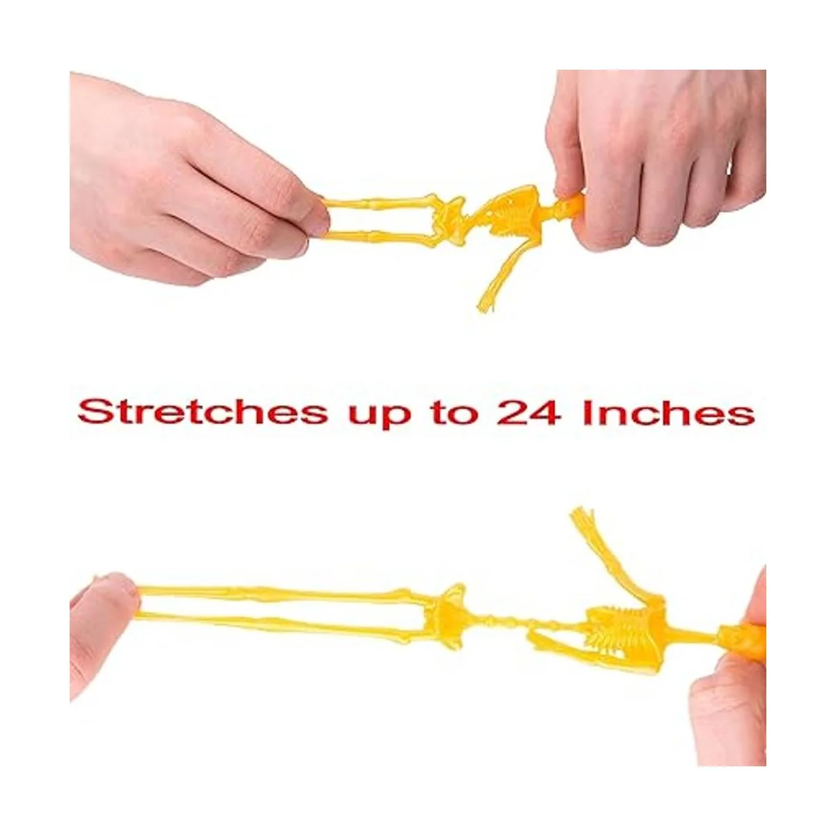 Cada esqueleto mide 3 3/4 pulgadas y se estira hasta 24 pulgadas. Los esqueletos tienen formas bien definidas. Cada juguete de esqueleto flexible está envuelto individualmente, y todos están empaquetados en una bolsa con cremallera altamente resistente. Cada envoltura contiene una advertencia de seguridad, por lo que estos juguetes de goma elástica se pueden utilizar bien como piñata, huevo de Pascua, bolsas de golosinas o bolsas de golosinas de Halloween.