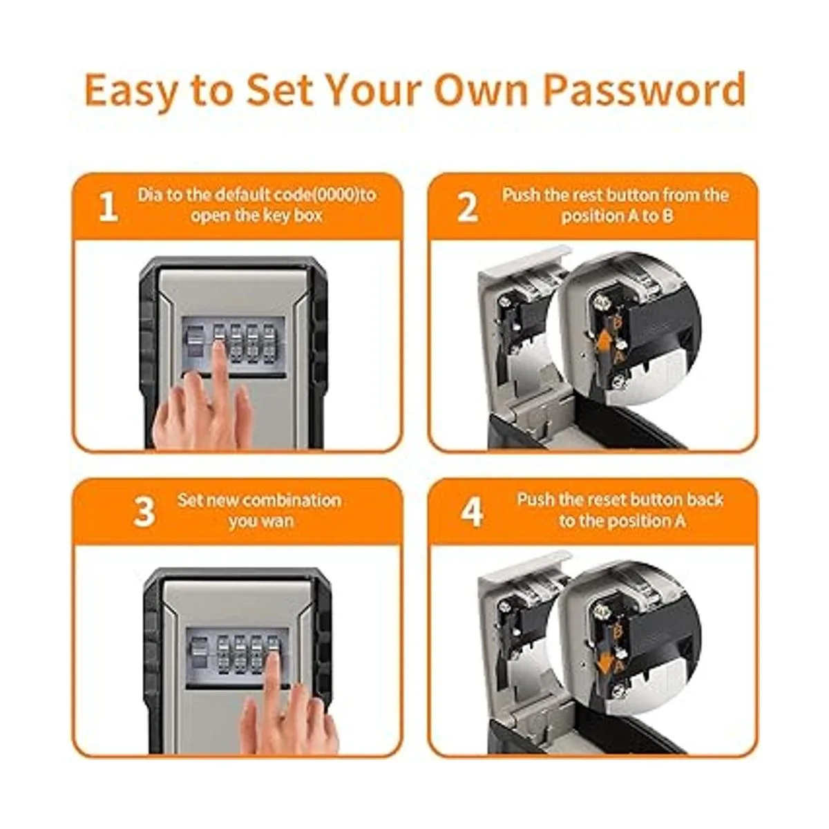 Seguro y duradero: esta caja de bloqueo para llaves está hecha de aleación de zinc y acero resistente, con un código de 4 dígitos que te permite establecer tu propio código combinado con 10000 opciones únicas, lo que garantiza la seguridad y la seguridad de tu llave. Asegúrate de grabar tu contraseña tomando una foto o nota después de cada vez que reinicies la contraseña, de lo contrario, no tienes forma de recuperarla.