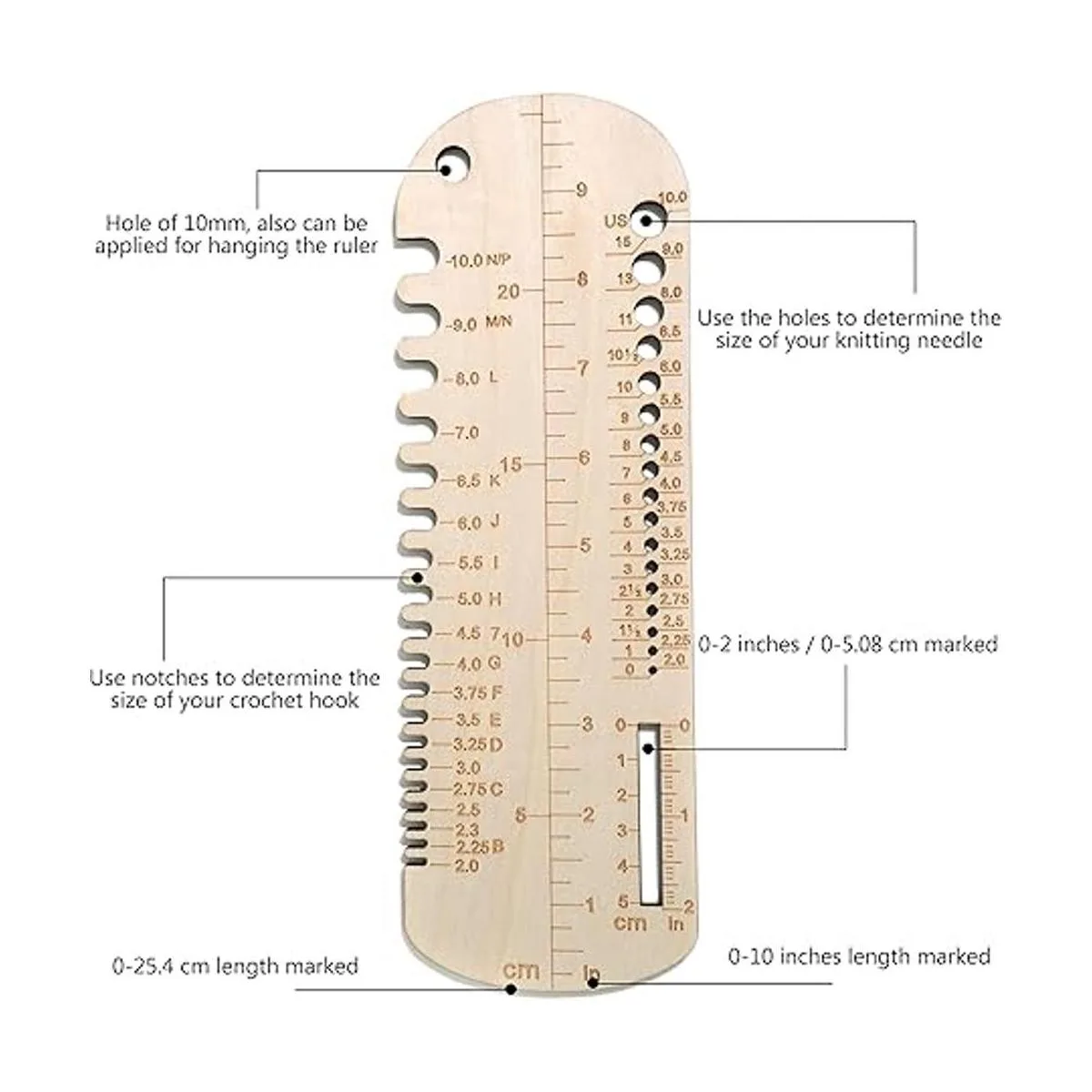 Calibre de aguja: si la marca de tamaño de la aguja está desgastada, puede ayudarte a confirmar rápidamente el tamaño. Utiliza muescas para determinar el tamaño del gancho de ganchillo. Utiliza los agujeros para determinar el tamaño de la aguja de tejer.