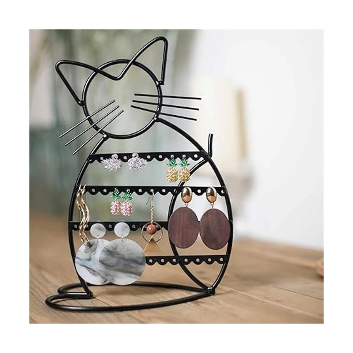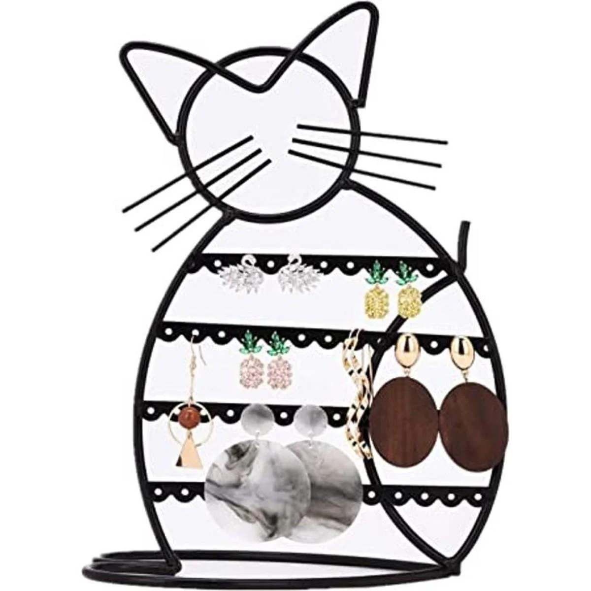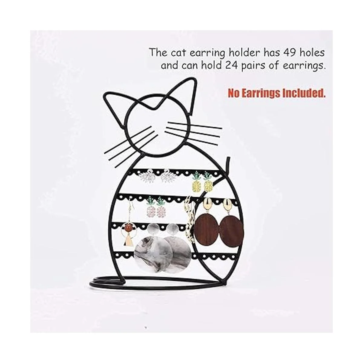 Urban Deco Organizador de joyas, soporte en forma de gato, organizador de aretes de metal, 48 agujeros para aretes, soporte de joyería, organizador de tocador de exhibición de joyería de metal para niñas, color negro