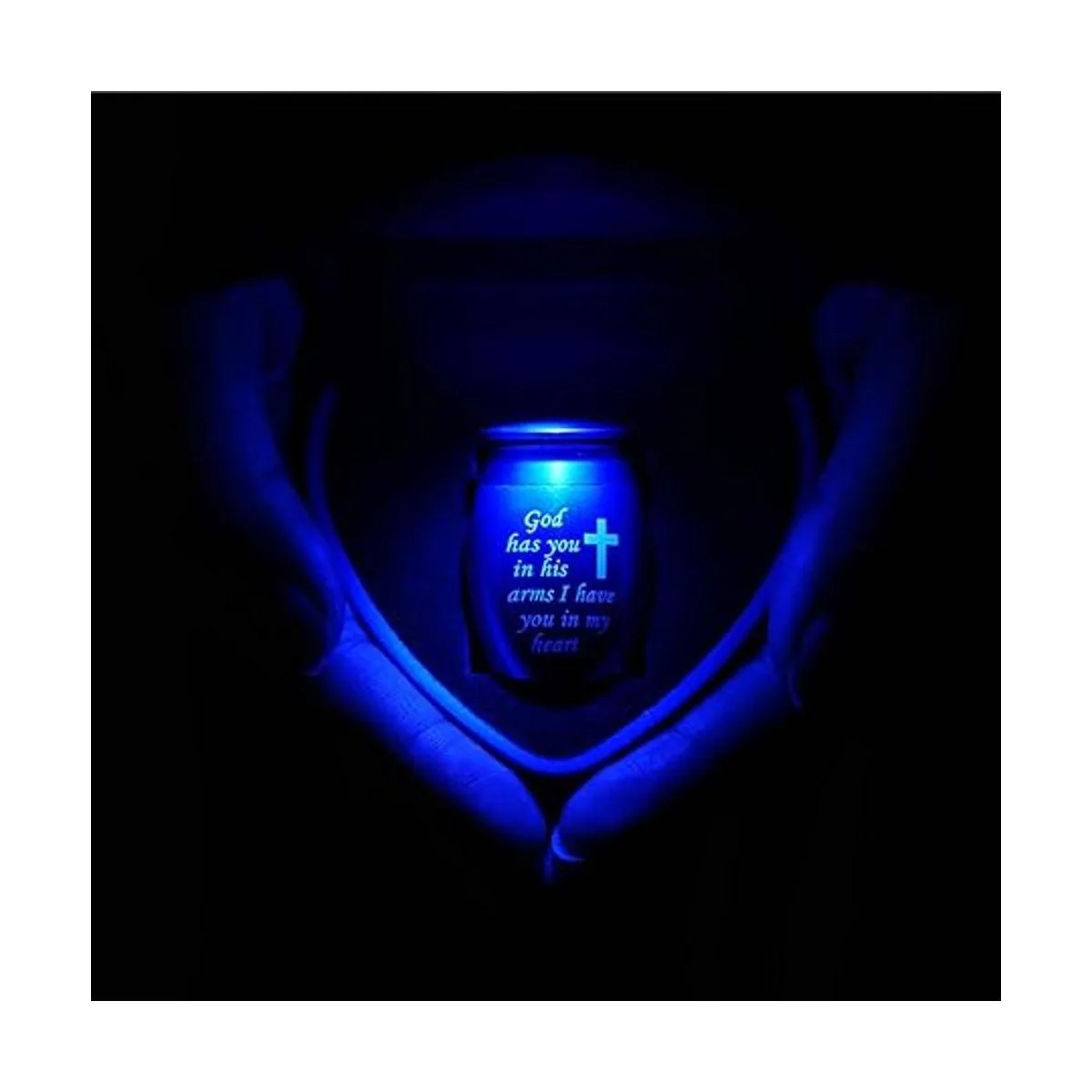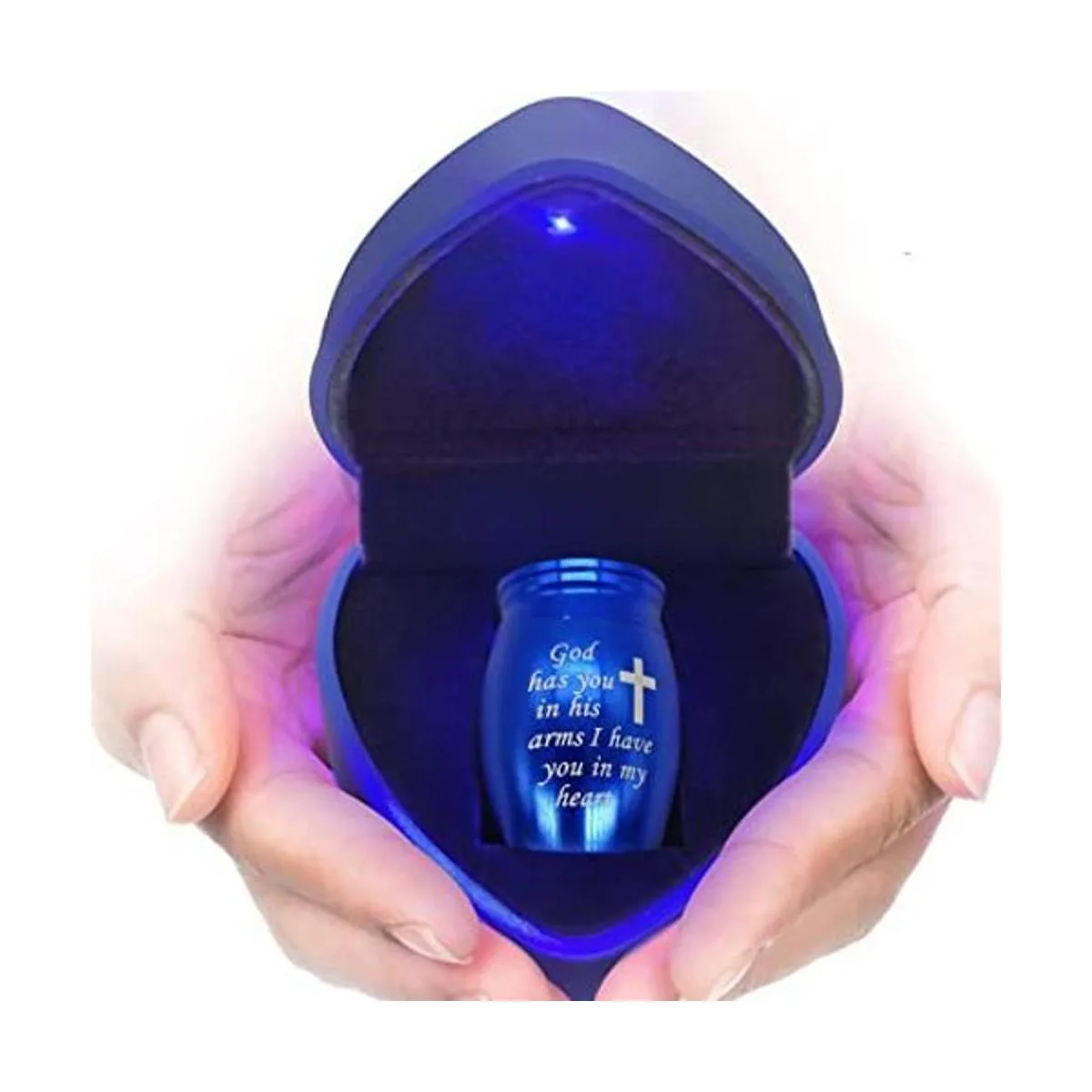 Funda de terciopelo con forma de corazón de alta calidad con luz azul: la funda de franela en forma de corazón con luz azul puede proteger la pequeña urna de recuerdo de arañazos. Muestra maravillosamente la urna de cremación.