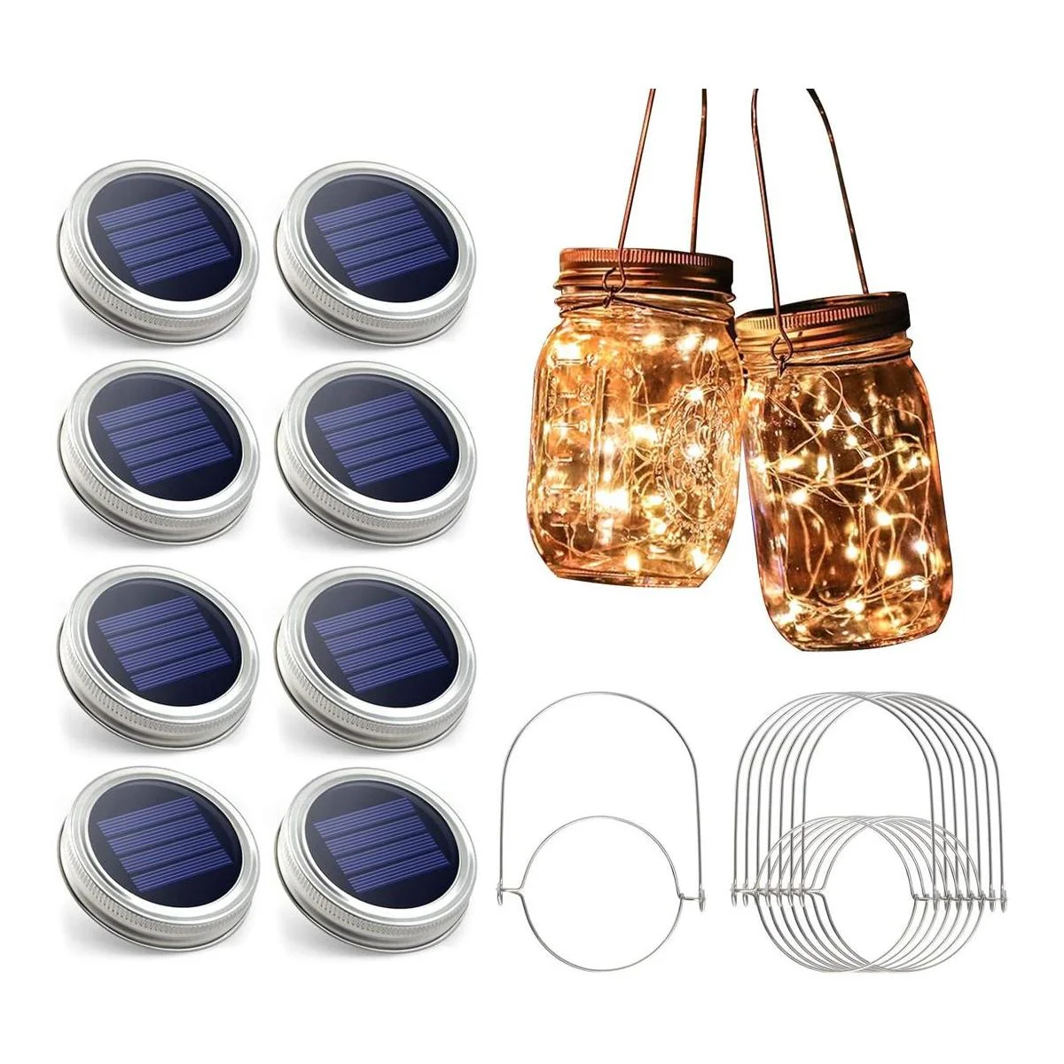Juego de luces solares para tarros Mason Paquete de 8 luces solares para tapa de tarro de energía solar, 30 LED y 8 ganchos tarros no incluidos, diámetro de la tapa: 2.756 in/inserto de 2.165 in, se adapta a la mayoría de tarros de conserva Mason de boca regular.
