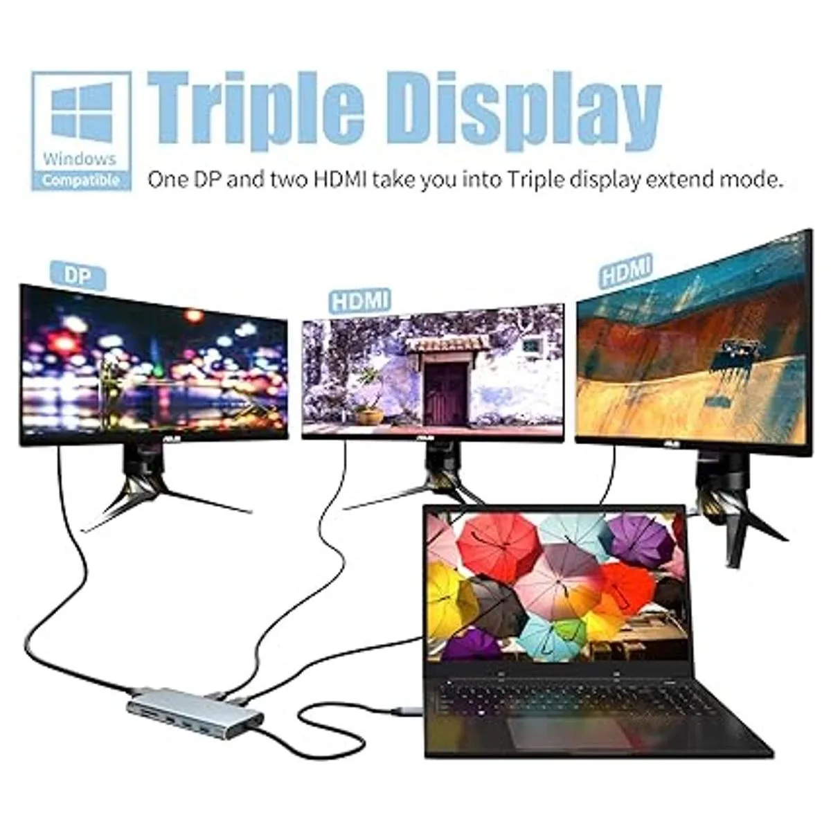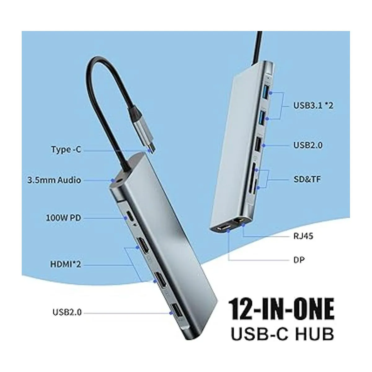 12 in 1 tripledisplay docking station, with two HDMI port,one DP port to achieve tripledisplay effect,USB 3.1, USB 3.0, 2 USB 2.0 allow your devices to simultaneously realize the data transmission of different monitors, one Ethernet connection port, one AUDIO, two SD/TF card readers, which can bring great convenience to your work.