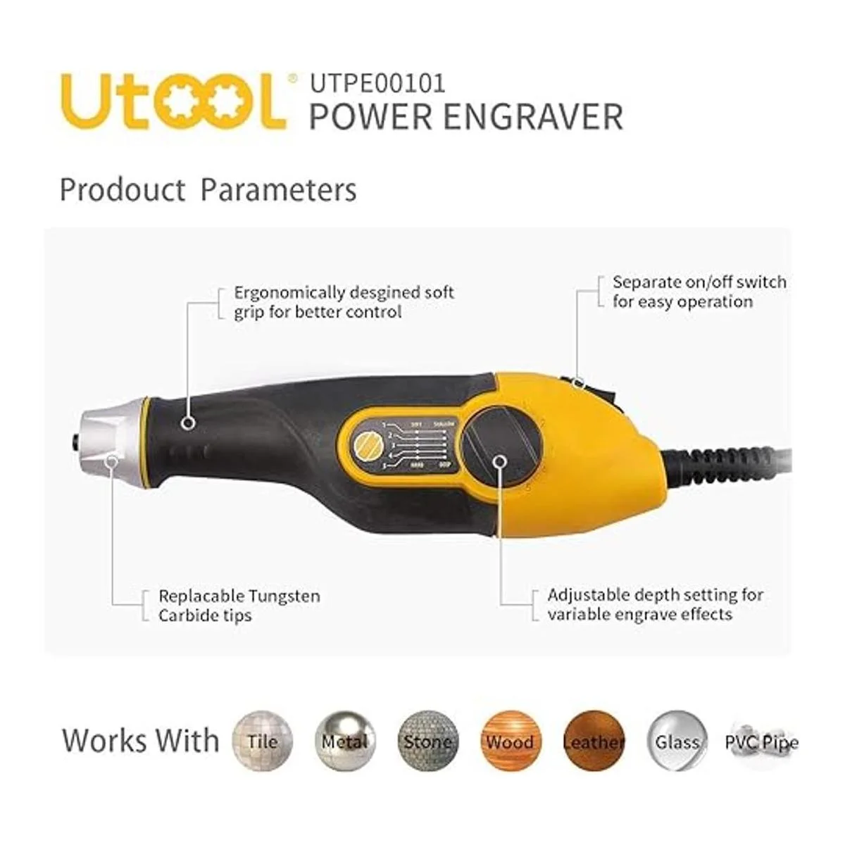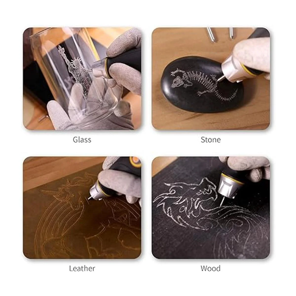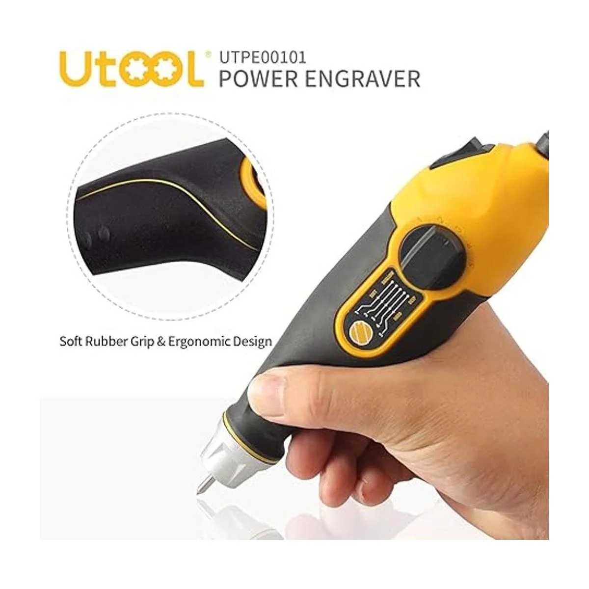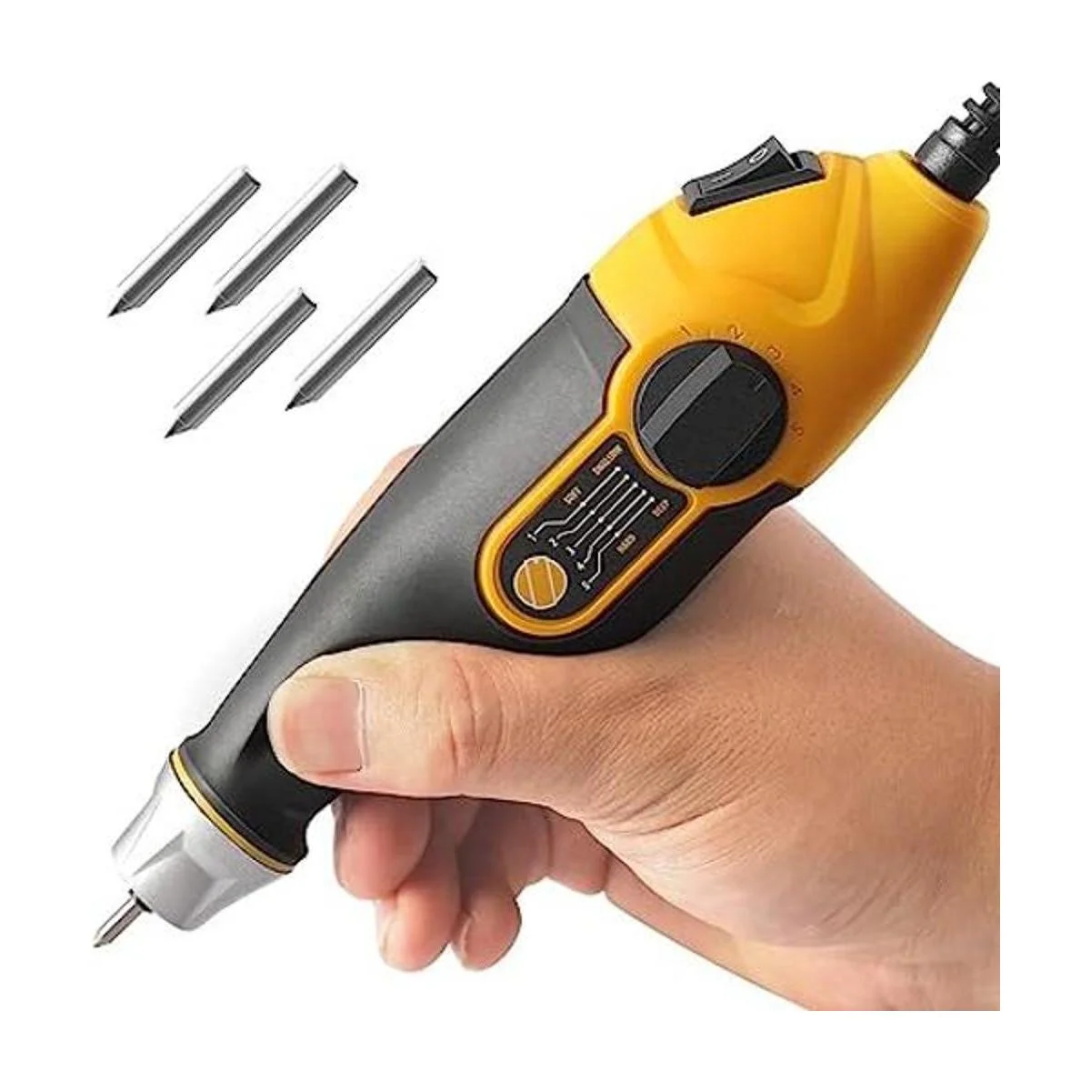 5 velocidades 4 puntas Desde madera más suave hasta hoja de metal más dura, el grabador proporciona múltiples profundidades y velocidades simplemente girando la esfera. 4 puntas de carburo de tungsteno auténticas que garantizan un rendimiento suave, estable y duradero.