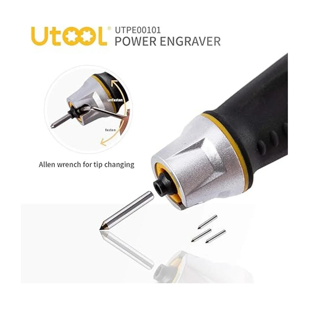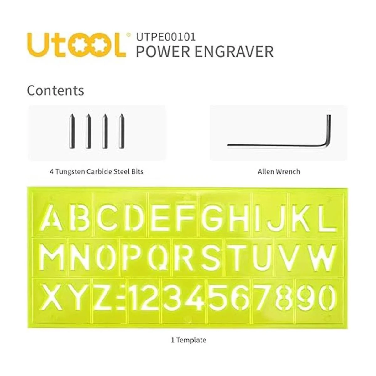 UTOOL Bolígrafo grabador con plantilla de letranúmero, herramienta de grabado de mano de 24 W para grabado de vidrio de metal de madera con 4 brocas de acero de carburo de tungsteno reemplazables