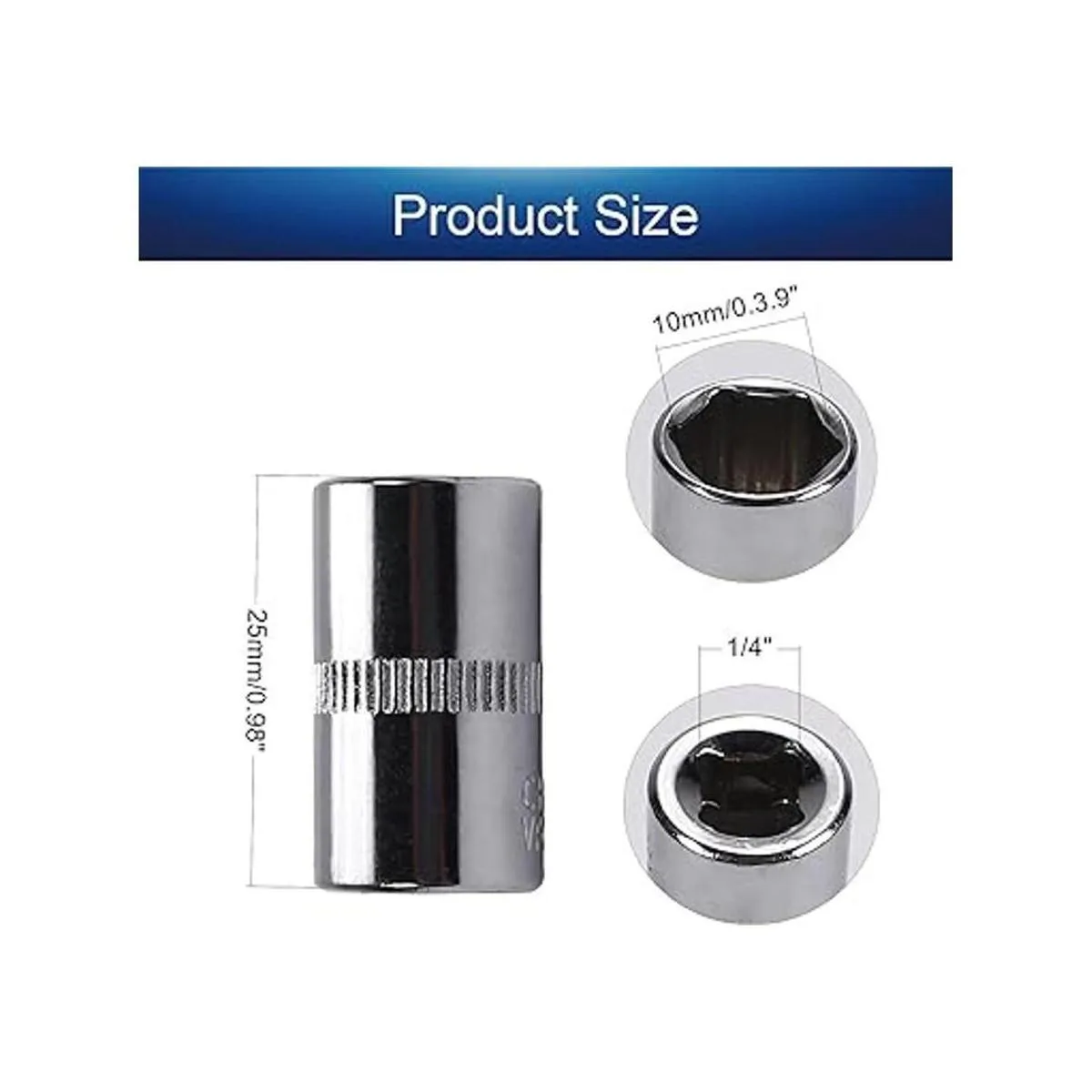 Parámetro: nombre del producto: enchufe de 6 puntos; especificación del enchufe: 0.394 in/0.39 pulgadas; longitud total: 0.984 in/0.98 pulgadas; especificación de la interfaz: 1/4 pulgadas; material: acero cromado vanadio; tratamiento de la superficie: chapado en cromo pulido.