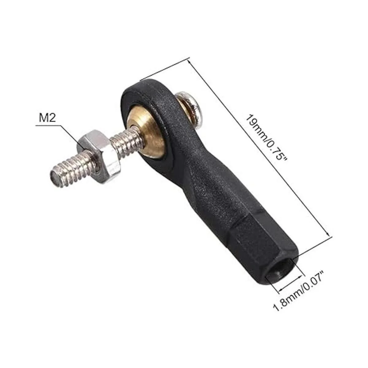 Características: diámetro del agujero central: 0.079 in, diámetro del agujero inferior: 0.071 in, longitud total: 0.748 in, rosca de la varilla: M2