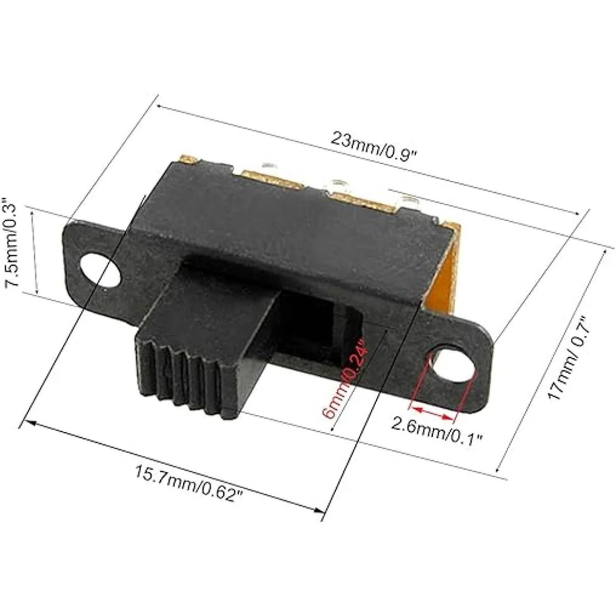 Tamaño total del interruptor: 0.9 x 0.3 x 0.7 in. Tamaño del pomo: 0.177 x 0.157 x 0.236 in. Material externo: plástico, metal