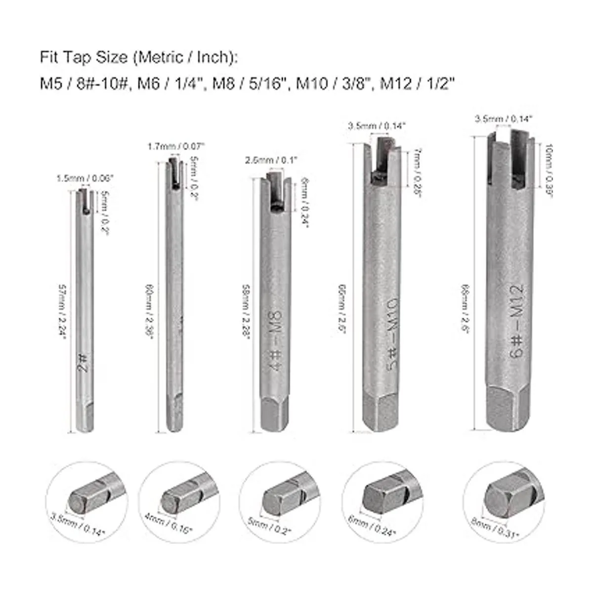 Extractor de grifo: Tamaño de grifo métrico / pulgada: M5 / 810, M6 / 1/4, M8 / 5/16, M10 / 3/8, M12 / 1/2, Modelo: 2, 3, 4, 5, 6. Hecho de acero de alto carbono, el extractor de grifo cuenta con alta dureza, alta resistencia y resistencia al desgaste.