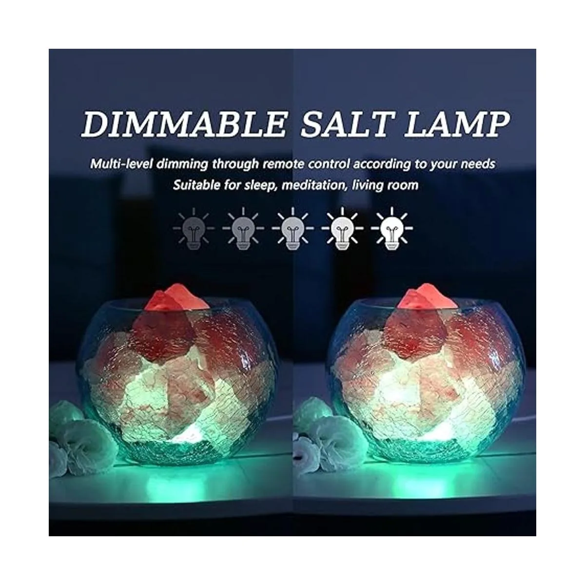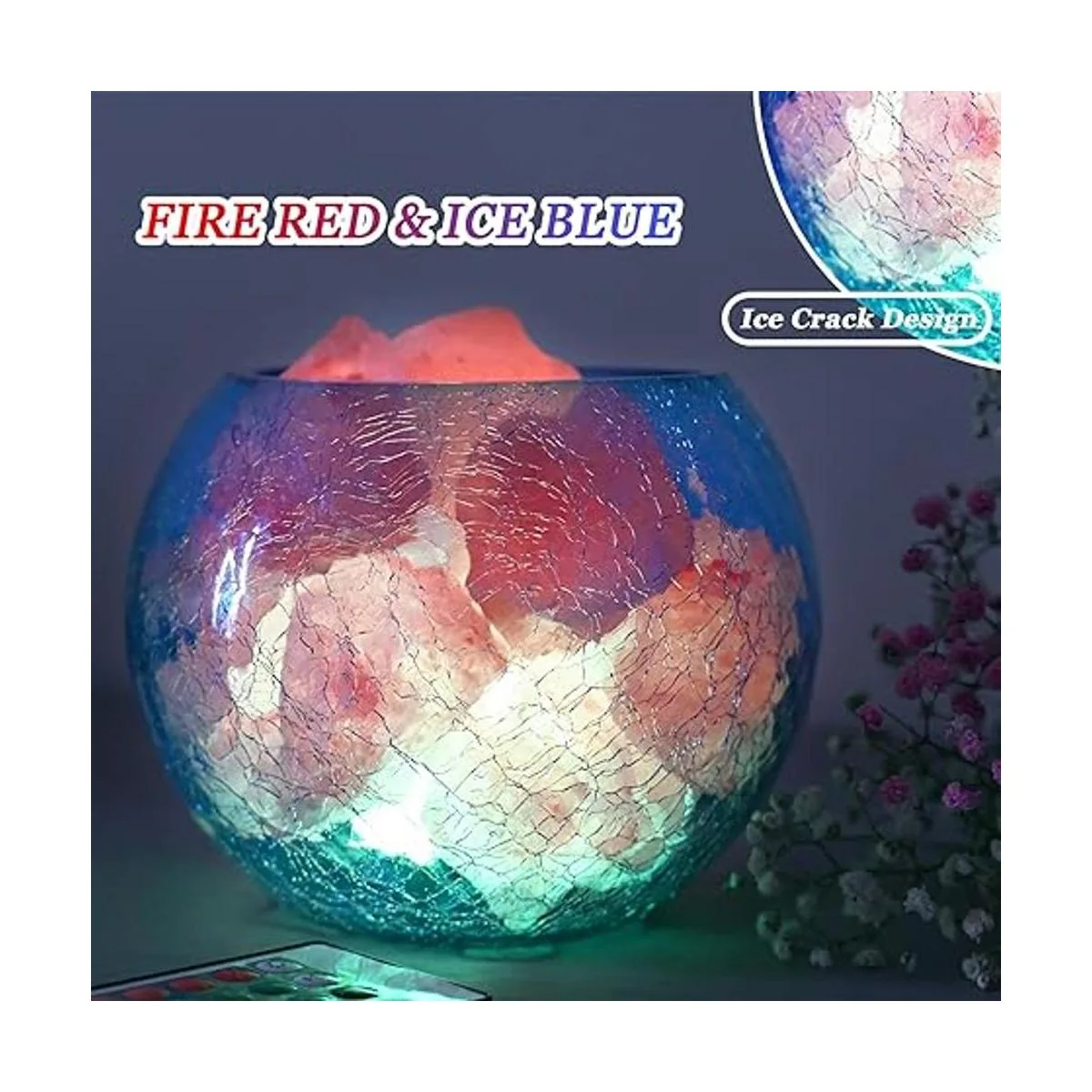 Diseño mejorado: lámpara de sal de cristal hecha a mano de 4.4 libras y 5.9 pulgadas cuenco de vidrio agrietado con hielo bombilla multicolor de 3 W cable USB. La roca de sal natural se puede liberar coloridas luces de sal por el cuenco azul agrietado con hielo. Simplemente conecta USB, la lámpara de sal grande se encenderá, proporcionando un ambiente hermoso y relajante para el dormitorio y la sala de estar.