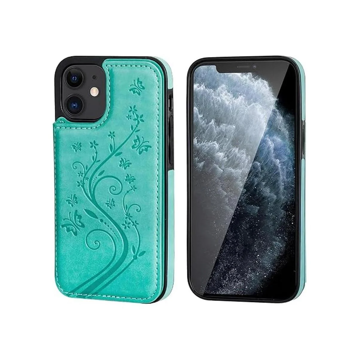 Vaburs Compatible con iPhone 12 y iPhone 12 Pro, cartera con tarjetero y patrón de mariposa en relieve, piel sintética, doble botón magnético, tapa a prueba de golpes, 6.1 pulgadas verde