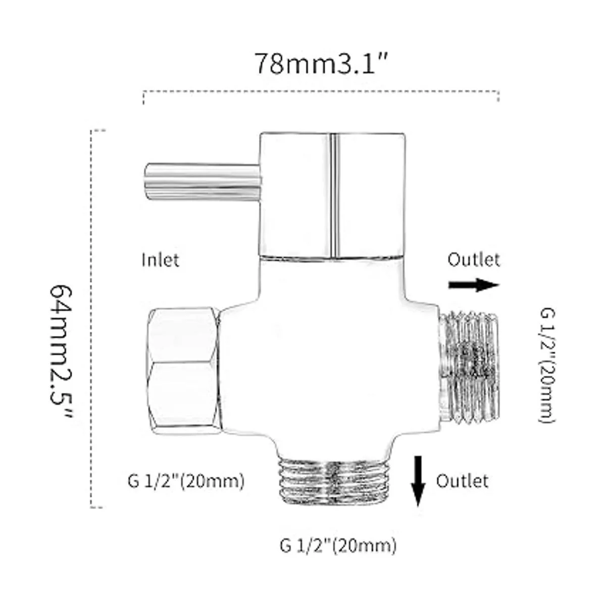 Interfaz universal: esta válvula desviadora de ducha es una entrada hembra estándar internacional G1/2 entrada de agua, dos salidas macho G1/2 salida de agua. Se aplica a la mayoría de cabezales de ducha y dijes de ducha.