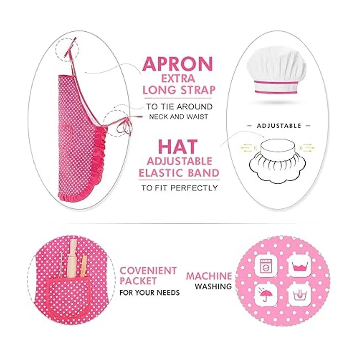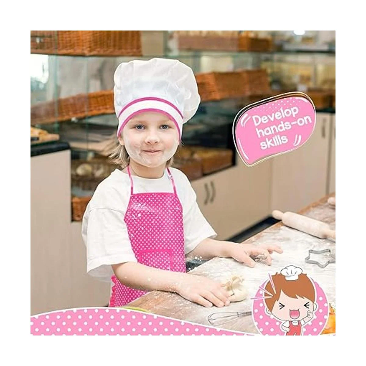 Diseñado para niños: El patrón de traje de chef es un fondo rosa de punto blanco, con ribete de volantes. El sombrero del chef es elástico, y el delantal tiene cuerda ajustable y bolsillo delantero. La cuchara y el rodillo de amasar están hechos de madera. Hay 4 formas diferentes de cortadores de galletas de plástico, nuestros cortadores de galletas son de plástico ABS, sin bordes afilados en lugar de cortadores de metal, no dañará la mano del niño mientras juega. Haz que los niños jueguen mucho más divertidos.