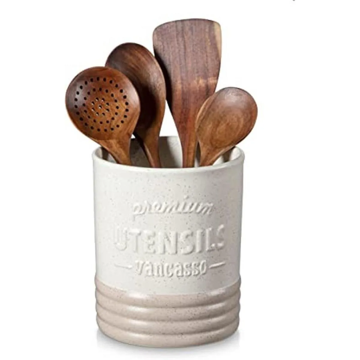Mulitiple Functions Kitchen Tool Storage The large capacity utensil holder means it is perfect for storing more spoons and spatulas, you can easily place 1015 spatula tools in ceramic utensil holder in the kitchen. The vancasso utensil holder can be used as a vase to decorate your dining table. It can also be used as a holder for farmhouse utensils and a wine cooler and keeps all your favorite kitchen tools clean and tidy.