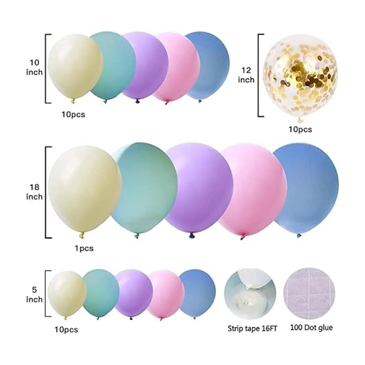 Guirnalda de globos pastel: este kit de globos pastel de unicornio incluye 5 colores y globos de confeti dorados: globos de color rosa pastel, globos azules pastel, globos verdes pastel, globos amarillos pastel, globos morados pastel. 10 pulgadas cada una de 10 unidades, 5 pulgadas cada una de 10 unidades, 18 pulgadas de 1 unidad. y 10 globos de confeti dorados de 12 pulgadas. Una cinta de globos y 100 pegatinas de puntos de pegamento.