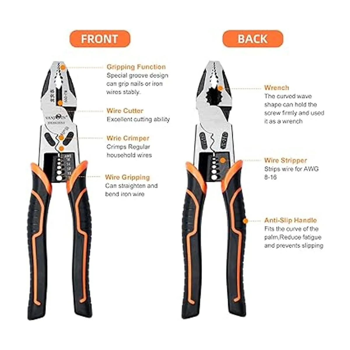 VANJOIN Linesman Alicates de combinación profesionales de 9 pulgadas, multiherramientas con llave para pelacables, crimpadora lateral, función de bobinado, alicates de extracción de tornillos, herramienta manual 9 pulgadas